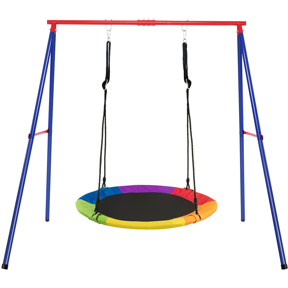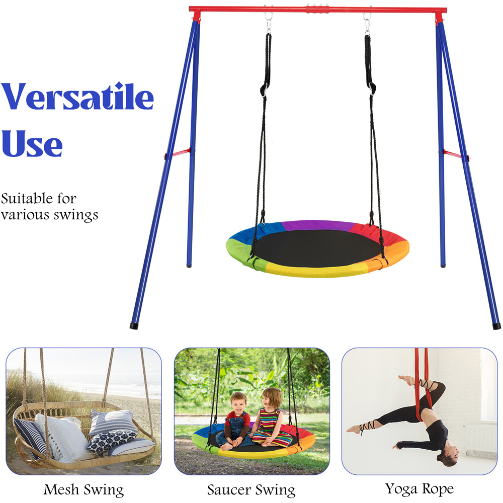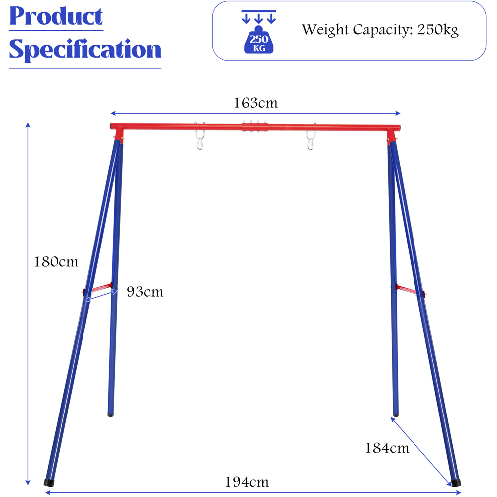 Elevate your garden fun with the Costway Blue and Red Metal Swing Frame with Ground Stakes and Carabiners. This swing is a vibrant addition that promises robust enjoyment for both adults and children. Crafted from premium steel, this heavy-duty swing stand supports a substantial load of up to 250 kg, ensuring safe and reliable swinging. The inclusion of ground stakes and foot caps enhances stability and safety, making it perfect for outdoor spaces like gardens and yards. Whether it's mesh swings, swing chairs, or saucer swings, the versatile design accommodates various swing types. It's an ideal choice for encouraging active play and family interaction, indoors or outdoors.