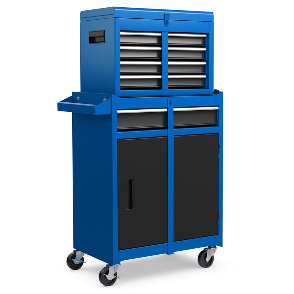 Upgrade your workspace with the versatile and robust Costway Blue Tool Storage Cabinet. This cabinet not only offers enhanced mobility with its lockable wheeled design but also features a 2-in-1 detachable design for space-saving flexibility. The upper chest, with its four drawers and top compartment, provides ample space for organizing various tools, while the larger bottom cabinet includes additional storage options with a tool hanging board and an adjustable shelf. Built from heavy-duty, rustproof metal, this blue tool chest is designed to keep your tools secure and organized, boosting your efficiency whether in a tool room, auto repair shop, or warehouse.