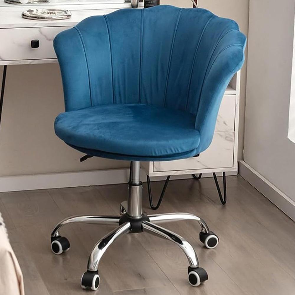 Elevate your workspace with the Costway Blue Velvet Adjustable Office Chair. Wrapped in skin-friendly velvet and supported by a high-density sponge, this chair offers a comfortable seating experience, perfect for long working hours. Its unique petal back design not only supports your body but also adds a touch of elegance to your office decor. The chair's height can be adjusted with a high-quality class-3 gas rod, making it suitable for various desk heights and user preferences. Equipped with a 360° swivel feature and smooth rolling nylon casters, it ensures maximum mobility around your work area. Whether used as an office chair, makeup chair, or an accent piece in your living room, its durable construction and stylish design make it a great choice for any setting.