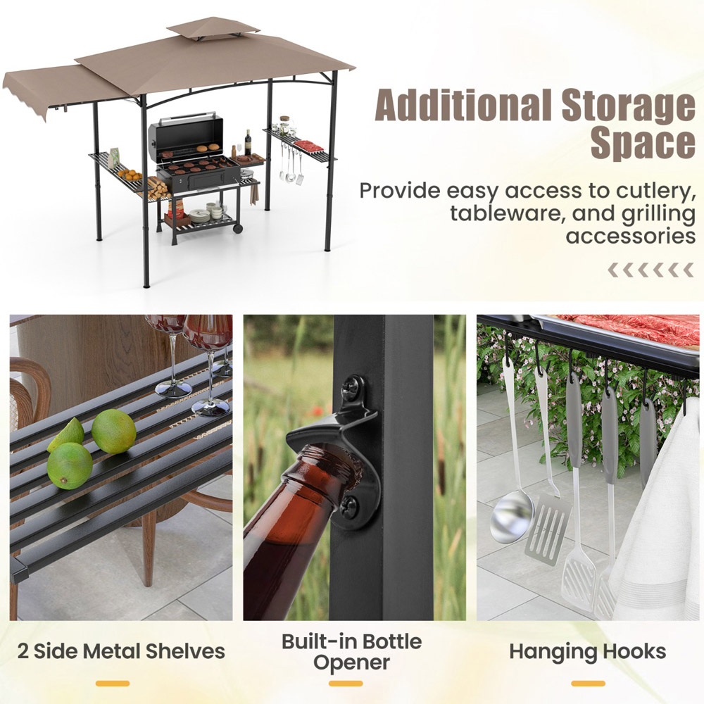Maximize your outdoor entertaining with the Outdoor Barbecue Canopy Tent Grill Gazebo, featuring a side awning in a chic beige tone! This 318 x 153cm large gazebo is designed to elevate your outdoor dining experiences, providing substantial shade and protection. Whether you're hosting a BBQ, picnic, or outdoor party, the folding side awning allows you to adjust the canopy to suit varying weather conditions effortlessly. The sun-protective and flame-retardant polyester canopy, coupled with a rustproof metal frame, ensures durability and safety, while the added convenience of bar tables and multiple hooks keep all your grilling essentials within reach. With a vented top for enhanced air circulation and wind resistance, plus easy installation thanks to thumb screws, this gazebo is a practical yet stylish addition to any garden.