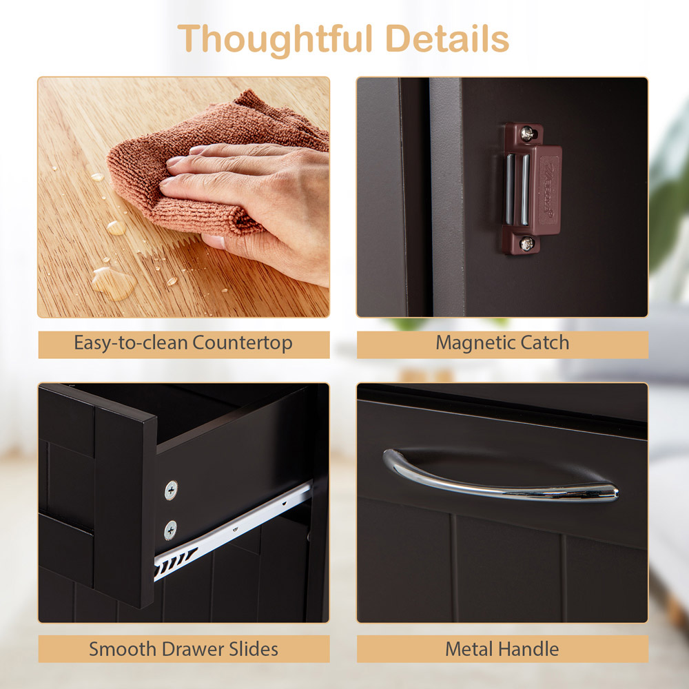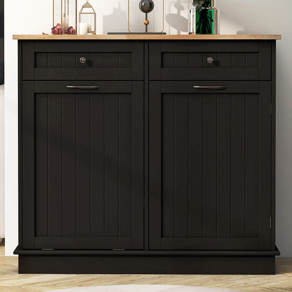 The hidden 70 L garbage holder is designed to keep pets away from waste and conceal unpleasant smells. For storage convenience, the rubber wood countertop offers additional workspace in your kitchen. Equipped with 2 drawers and 3-position adjustable shelf, this trash bin cabinet enlarges ample storage space for kitchen essentials. For reliable structure, the anti-toppling kits enhance stability and provide peace of mind, especially in homes with pets or children. Not just for the kitchen, this recycling cabinet can be used in the laundry room, living room, or dining room. Concealed Waste Solution: This tilt out trash cabinet is designed to secure your kitchen waste. With 70 L hidden garbage holder, the storage cabinet can discreetly manage trash while keeping pets out and smells contained. Classified Storage Space: The rubber wood countertop provides additional space for meal preparation. Storage is aplenty with 2 pull-out drawers, perfect for storing utensils. Additionally, the large cabinet comes with 3-position adjustable shelf to fit items of different sizes. Sturdy & Stable Structure: The trash can cabinet is constructed with thickened board for durability. For higher safety and stability, the recycling trash cabinet is equipped with anti-toppling device to prevent accidents. Multifunctional Design: In addition to a kitchen trash bin cabinet, it can used as a laundry basket in the laundry room, a recycle bin, a pet food storage cabinet or a coffee bar in the living room. Its elegant design blends seamlessly with any home style. Thoughtful Details: The easy-to-clean countertop makes maintenance a breeze. Fitted with magnetic catch, it is smooth and mute to open the door. Just feel free to grab the metal slides and handle to pull out the drawer.