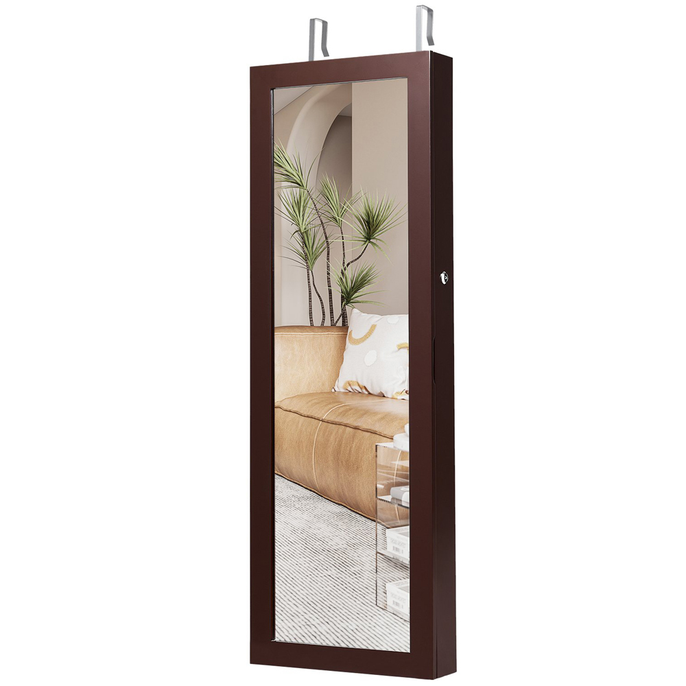 Say goodbye to tangled necklaces and misplaced earrings with this Costway Brown Lockable Mirror Jewellery Cabinet with LED Lights. It features a full-length mirror and interior LED lights for clear visibility, even in low light. The cabinet's spacious interior is designed with 108 earring slots, 36 earring holes, 24 bracelet hooks, 78 ring slots, 12 necklace hooks, five shelves, two bottom drawers, and a hanging rod, providing ample room for all your accessories. Made from high-quality MDF with a protective velvet liner, it ensures your jewellery stays scratch-free. The lock and two keys add security, while the magnetic closure allows for easy access. With versatile installation options, the cabinet can be wall-mounted or hung over a door using the adjustable hooks and hardware provided. The full-length mirror provides a clear, distortion-free reflection.