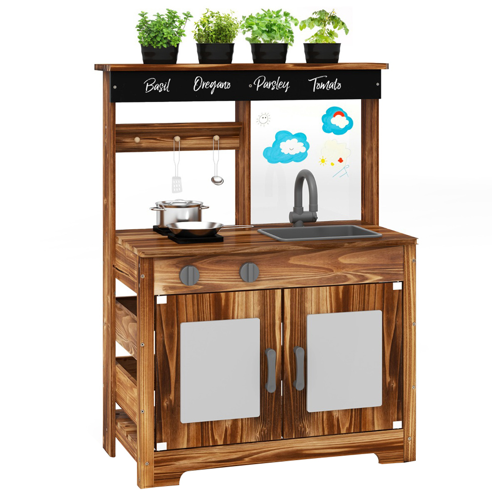 Introduce your little ones to the joys of outdoor cooking and gardening with the Costway Mud Kitchen Fir Wood Play Kitchen. Featuring a solid fir wood construction, this durable play kitchen is equipped with four planting pots and a removable sink, allowing children to switch between mud and water play. The dual stoves and accompanying cooking tools offer endless pretend cooking fun, while the personalised blackboard and DIY acrylic board let kids customise their space and showcase their plant names creatively. Ideal for fostering social skills and enhancing imaginative play, this kitchen set is a safe and engaging gift for children aged three and above.