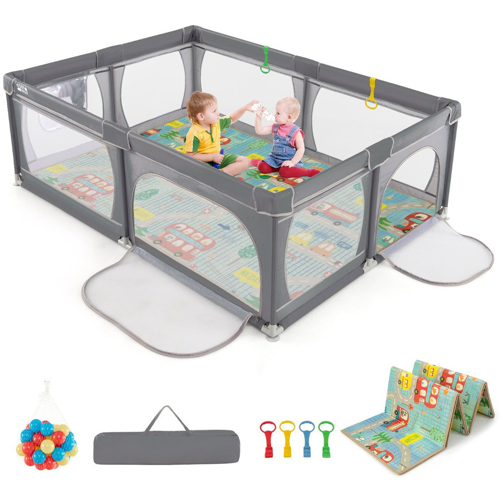 Ensure your little one's playtime is both fun and safe with the Baby Playpen with Mat and 4 Pull Rings in Dark Grey. This playpen is designed with zippered doors for security and all-around mesh walls for ventilation, ensuring you can keep an eye on your baby while they explore. The play area is generously sized and features a double-sided mat that not only provides a soft surface for crawling but also includes a baby height growth chart. With 50 ocean balls included, your child will have endless entertainment, and the four pull rings will help them practice standing and walking. The playpen is crafted from durable oxford fabric and supported by sturdy metal pipes, promising long-term use. It also includes a mesh storage bag for easy access to baby essentials and a portable bag for convenient storage and transport.