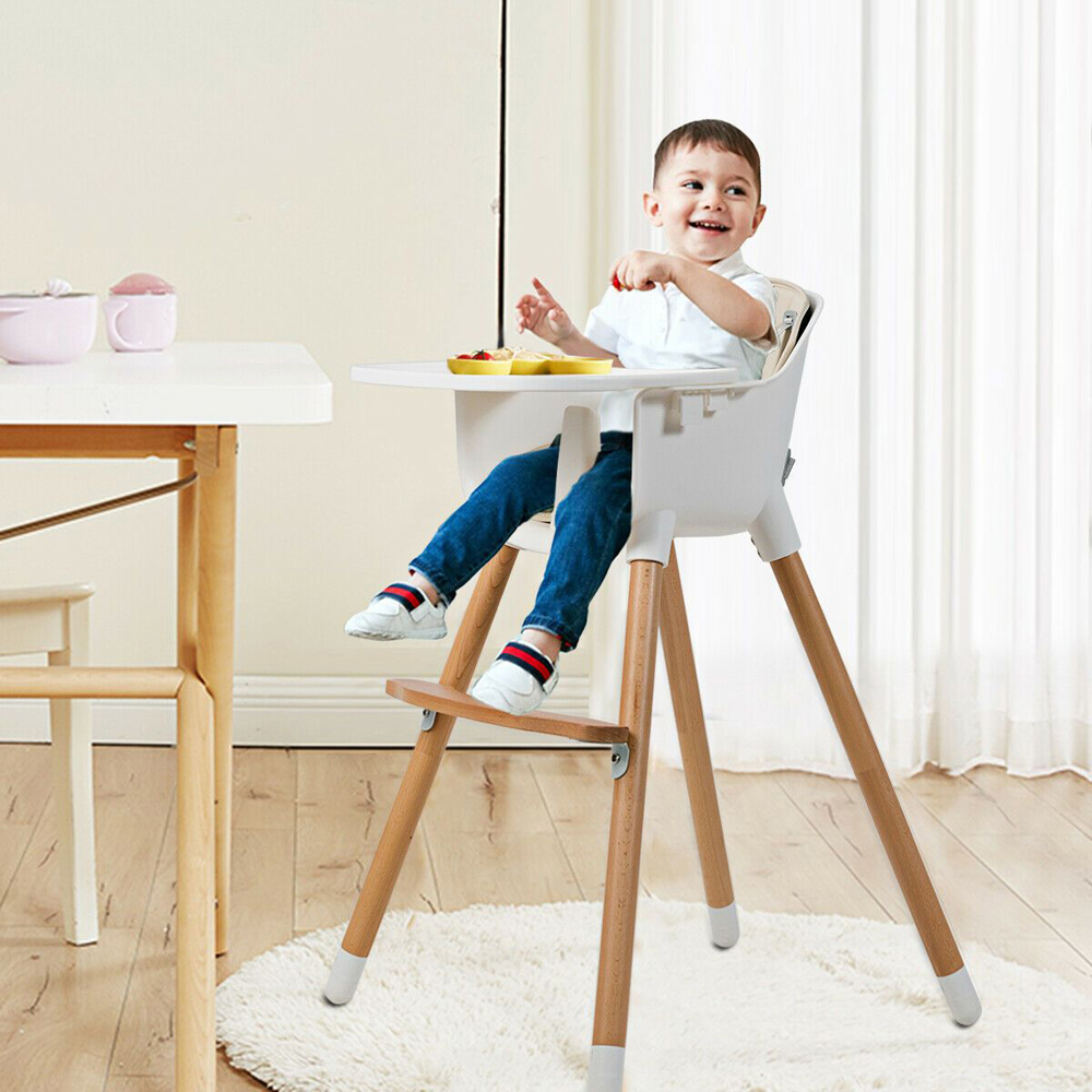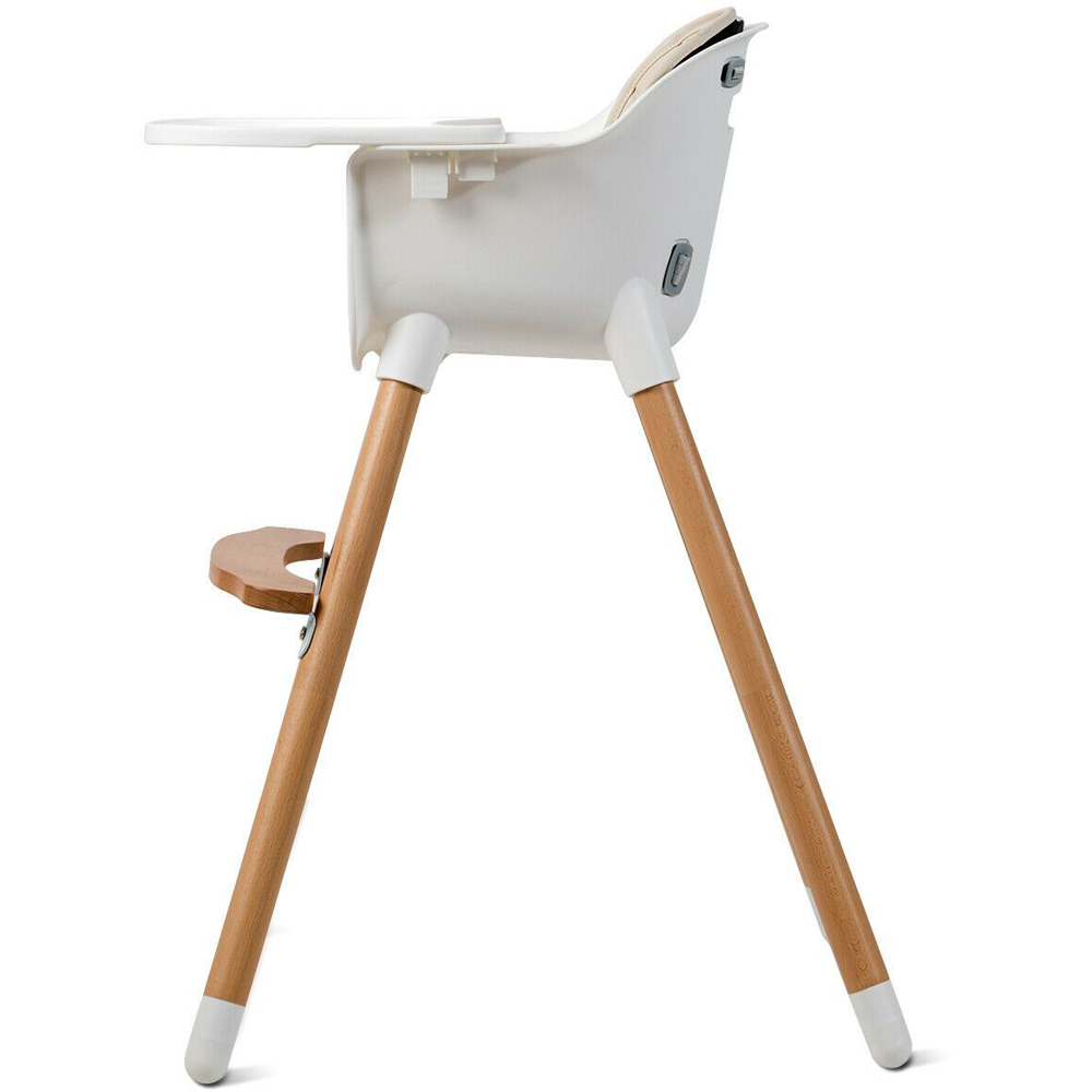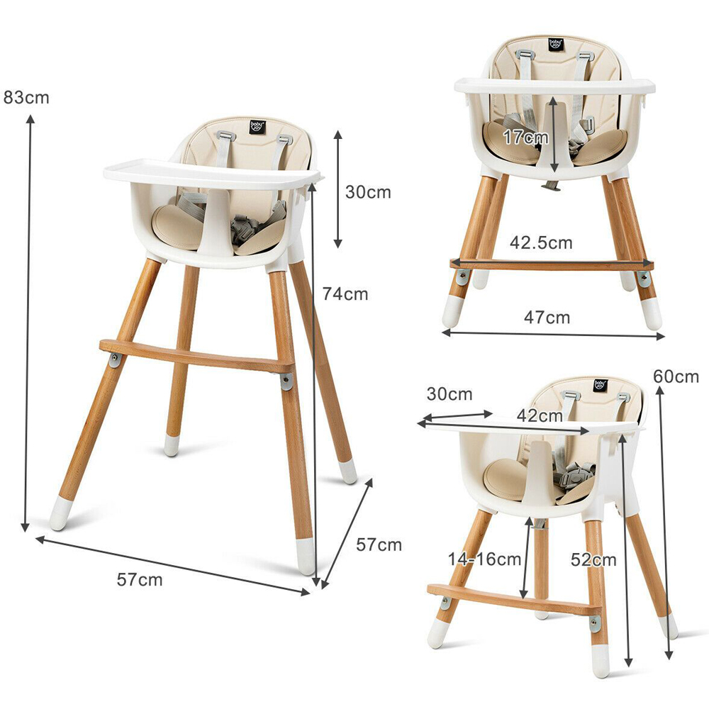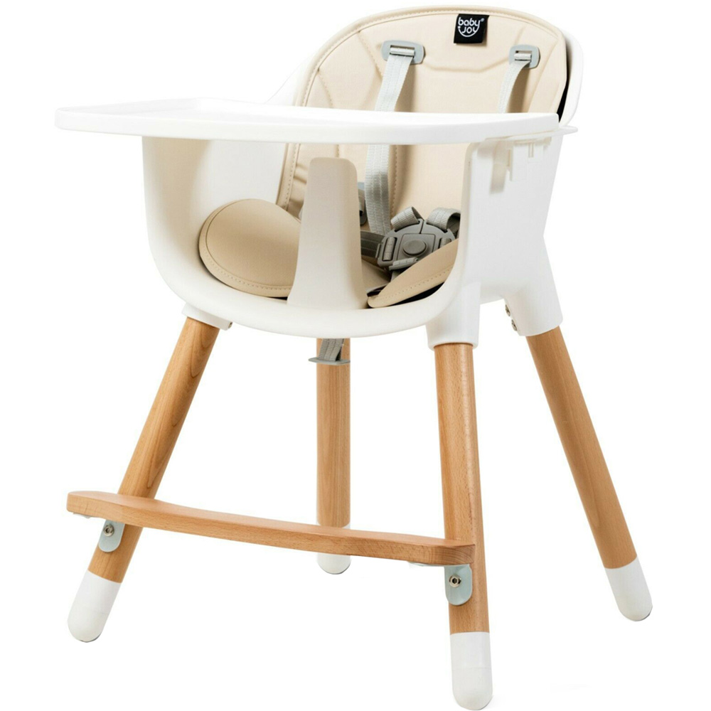 Let your little one enjoy their first taste of food with the Costway Dual Combination Padded Highchair. This eye-catching dual chair transforms from a highchair to a toddler chair easily and is suitable from 6 months to 3 years. The high-quality beech legs have non-slip rubber feet and the seat is padded for maximum comfort. The stylish, moulded seat is easy to wipe clean and the multi-position tray can be removed. With an adjustable footrest and secure safety harness with a central post your little one will be safe as well as comfortable. Offer your child a safe seat at the table with this dual high or low chair legs made from high-quality beech, which are safe and stable. Transforms from high chair to low chair by simply twisting the legs and removing a section to decrease the height. Removable food grade plastic tray Non-slip adjustable feet protect floors from scratching and the chair moving. Adjustable five-point safety harness and stylish modern design multiple purpose chair, great for children to eat play or just sit in. Widely used in the home, restaurant, hotel, etc. High quality finish protecting from scratches or injuries.