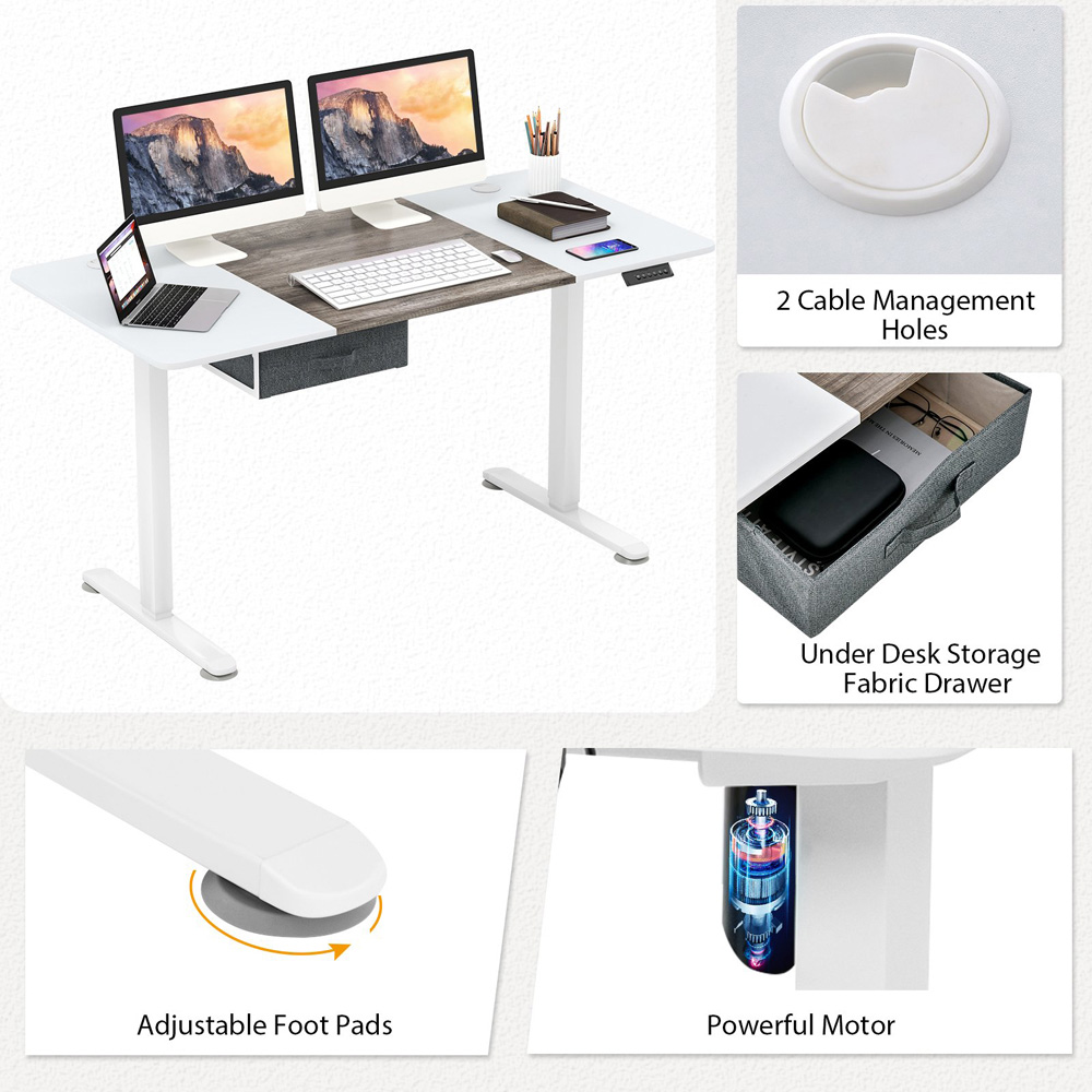 Elevate your work experience with the Costway Electric Height Adjustable Standing Desk Grey. Features a seamless lifting system that allows for adjustments between 72 and 116 cm. This desk not only promotes a healthy balance between sitting and standing but also includes a USB charging port for keeping your devices powered up. With its advanced memory settings, you can easily switch to your preferred height at the touch of a button. The spacious grey desktop offers ample room for all your office essentials, while the integrated storage drawer and cable management keep your workspace neat and organised. Designed to cater to your comfort and efficiency, this desk is an excellent addition to any home office.