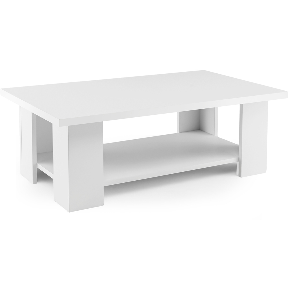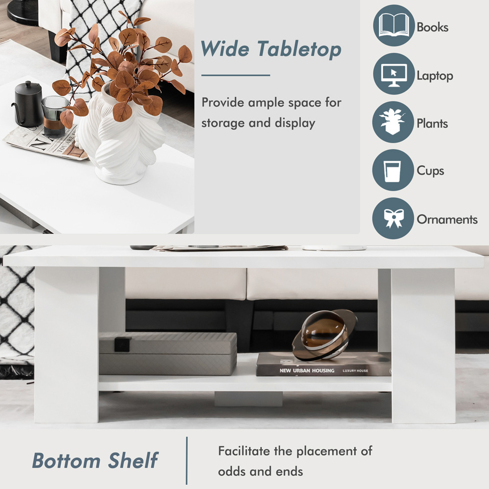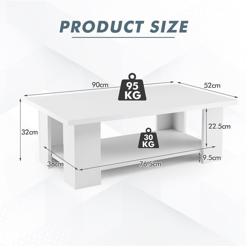 Make a classy addition to your living space with this Costway Engineered Wood White Coffee Table. This modern coffee table is a great choice for your living room, featuring an elegant white colour and clean lines for a contemporary look. It is built with quality materials and strong connections, providing a solid structure that can support over 91kg. The open shelf offers extra storage space for snacks, magazines, game consoles, and stereos, helping to keep your living room organized. Made of thick engineered wood, it is sturdy and durable, and the five bottom legs provide reliable support, while the non-slip foot pads protect your floor from damage. Whether in the living room or reception room, this coffee table combines style and practicality to enhance your space. All necessary accessories and instructions for assembly are included, and the smooth surface is easy to clean and maintain.