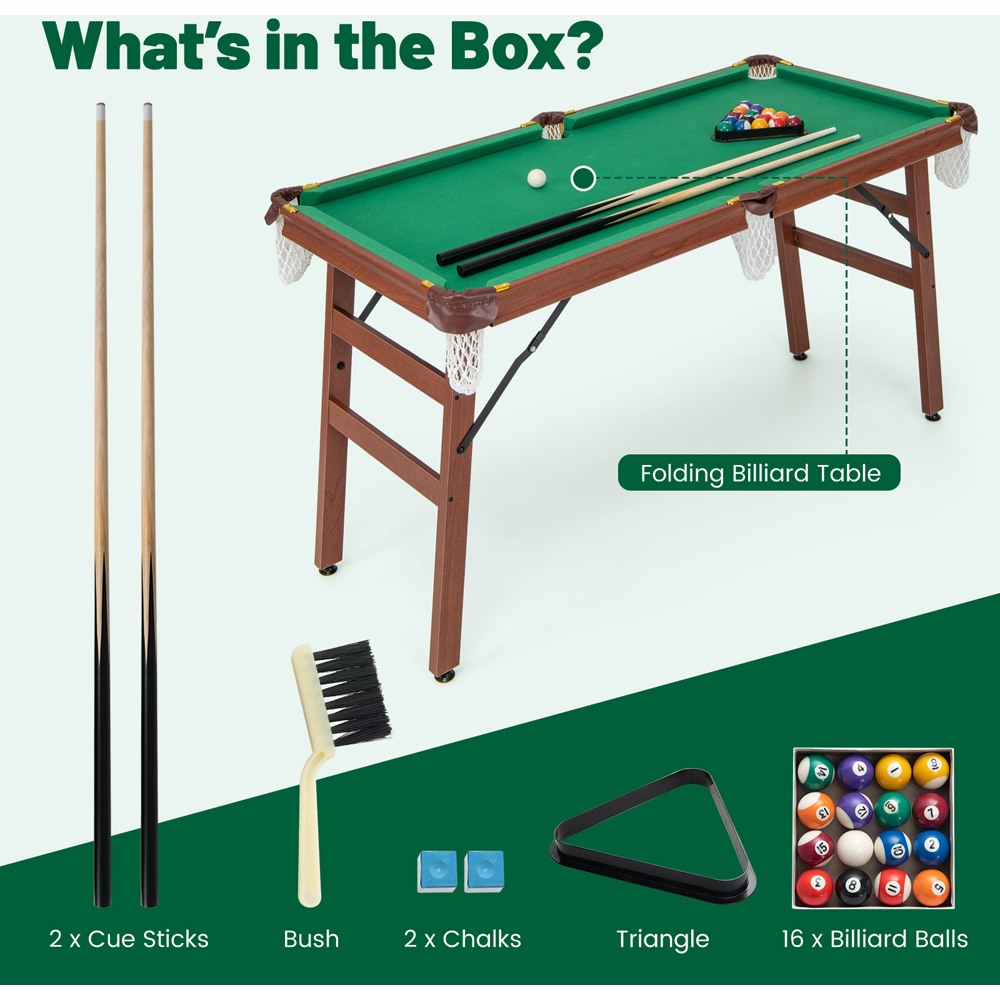 Revamp your entertainment options with the Costway Folding Billiards Table Set, a perfect blend of convenience and style! This innovative foldable pool table transforms any room into a game area without permanently occupying space, thanks to its easy folding design. Suitable for everything from family gatherings to office breaks, this table is crafted with a robust frame and reinforced crossbars, ensuring stability and durability. Adjustable foot levellers and exquisite leather-protected corners enhance the playing experience, while the complete set of accessories, including cue sticks, billiard balls, and more, means you can start the fun right away!