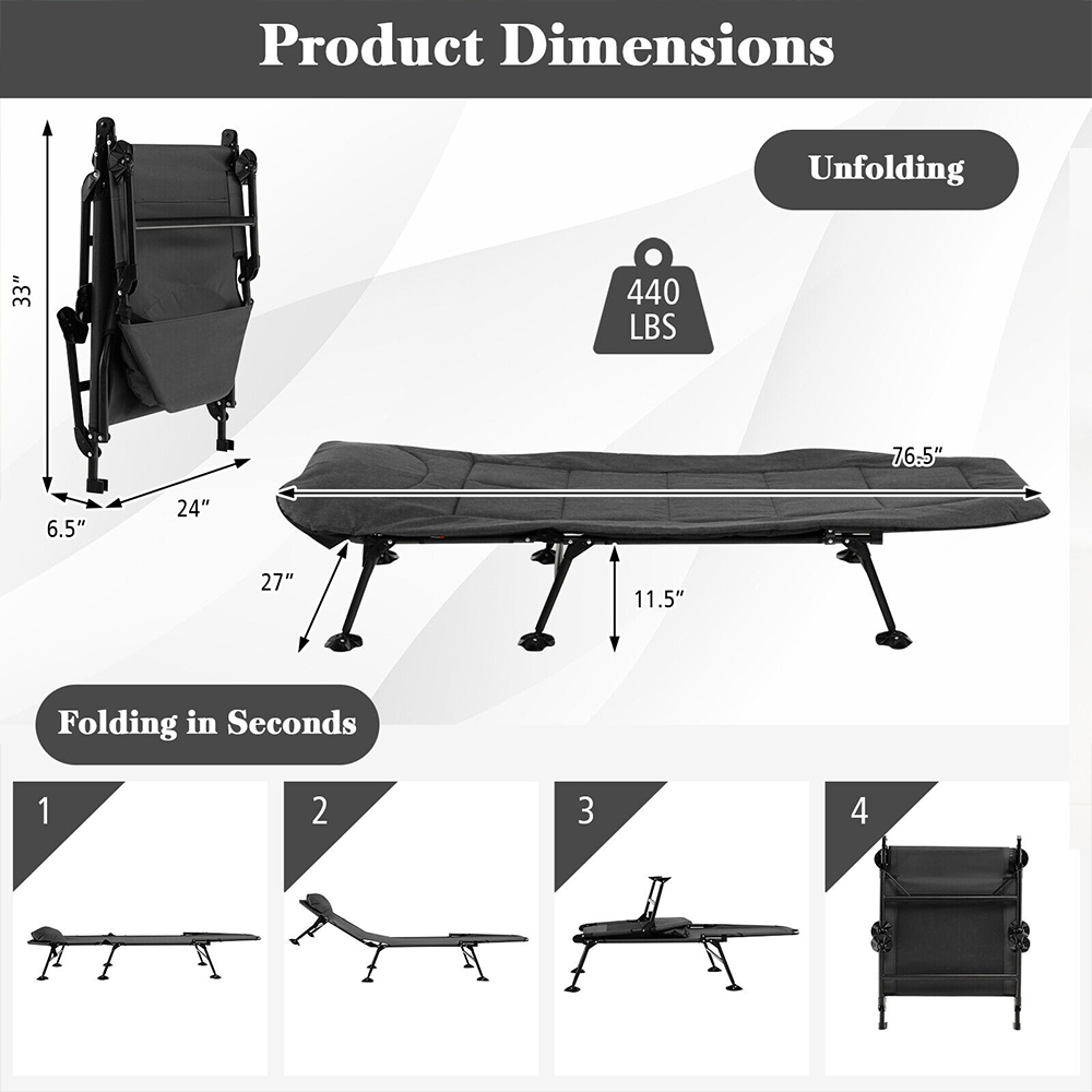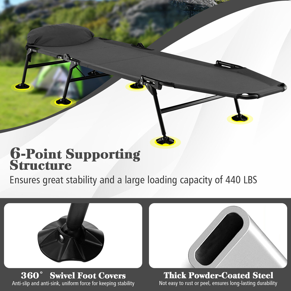 Enjoy your outdoors with Costway Folding Camping Cot with Detachable Mattress Grey. This folding camping cot, measuring and weighing 6 kg, is perfect for outdoor activities. It features a 6-position adjustable backrest, durable Oxford fabric, and anti-rust powder-coated steel, ensuring high strength and durability. The breathable fabric keeps you cool in hot and wet seasons, while the included soft padded mattress provides comfort in cold seasons. The cot can be folded compactly 61 x 16 x 84cm for easy transportation and storage. Constructed with thick powder-coated steel and a 6-point supporting structure, it supports up to 150 kg. The removable mattress, filled with soft sponges, and a padded pillow offer a comfortable lying experience. The bottom layer is made of waterproof, wear-resistant 600D oxford fabric. Additionally, the cot is equipped with 360° swivel foot covers to prevent sinking into soft ground, making it suitable for various environments like grass, forest, beach, RV, deck, patio, and indoor spaces. Dimensions: 195 x 66 x 30cm.