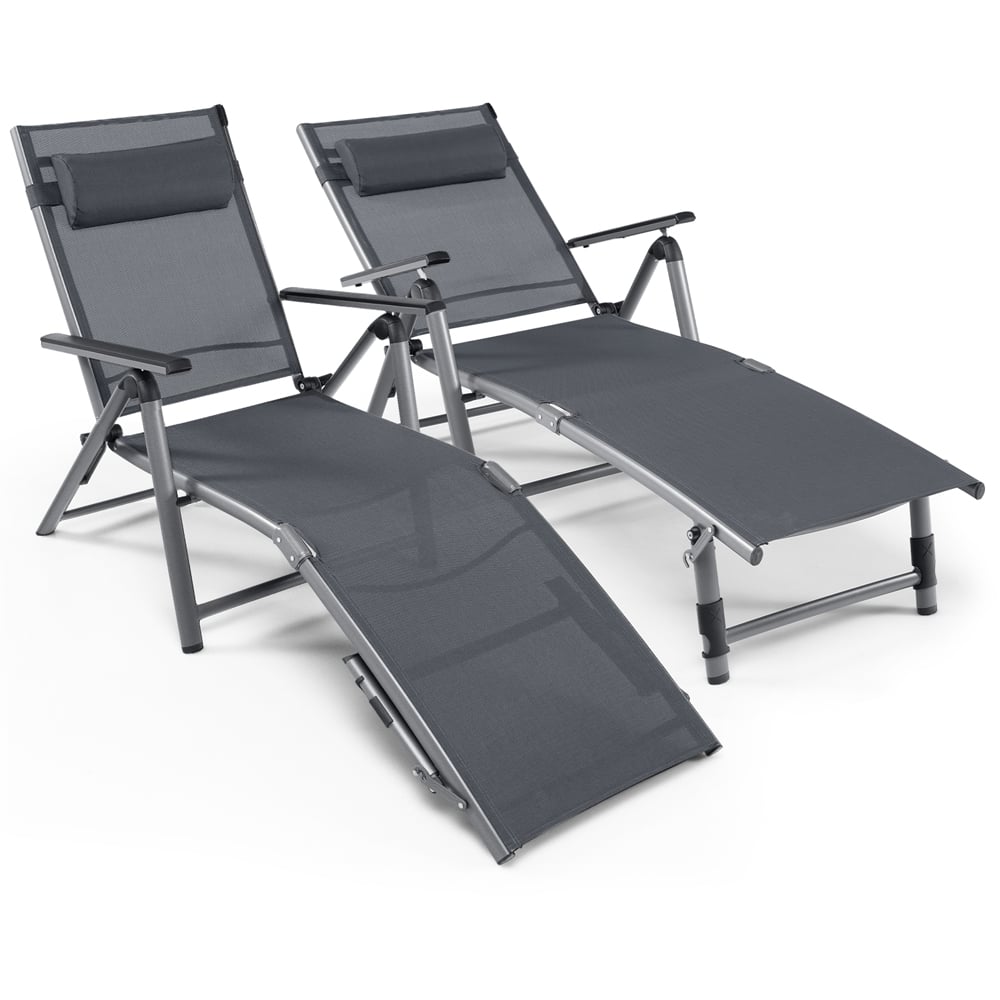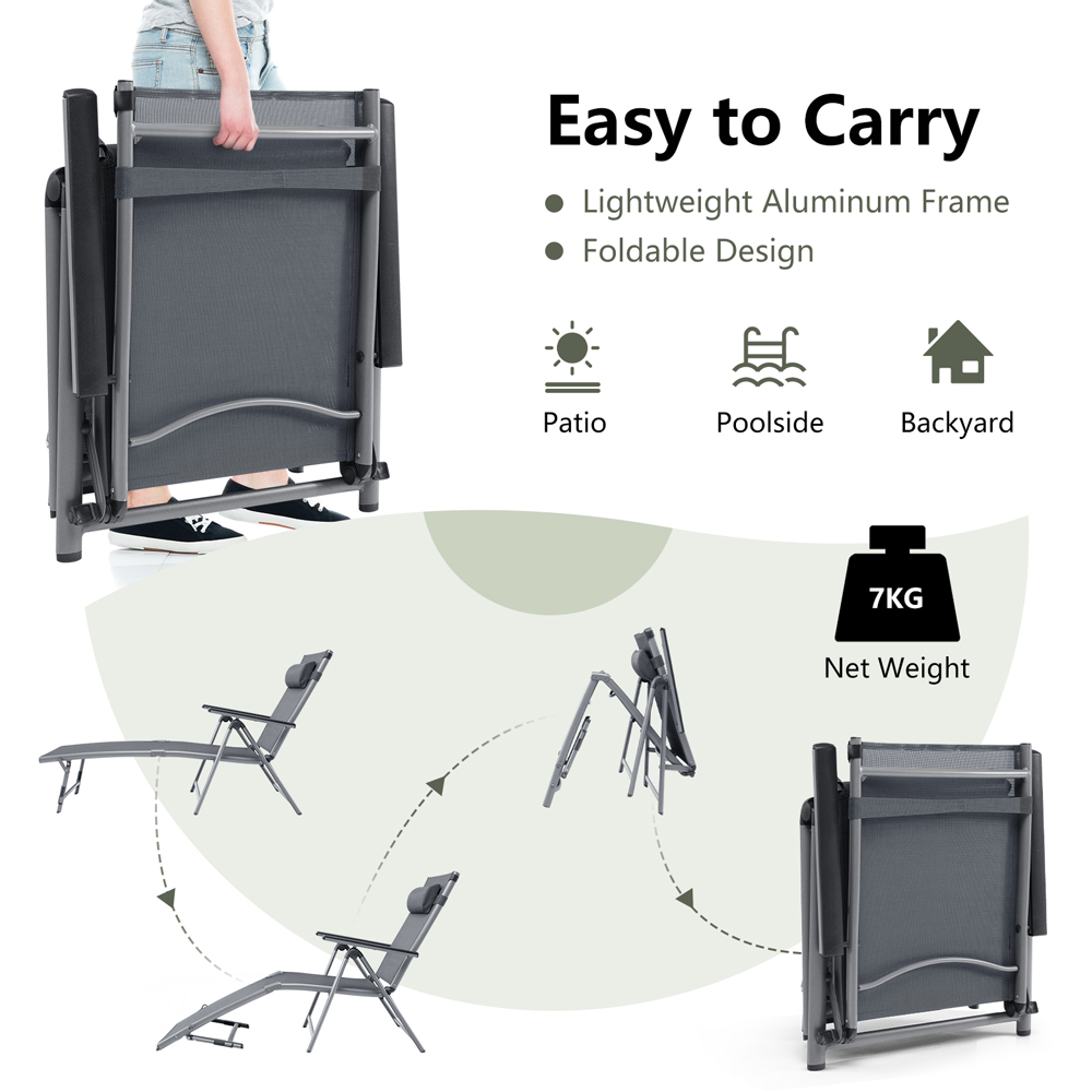 Relax outdoors and enjoy the evening with the Costway Folding Chaise Lounge Chair. This adjustable patio chaise lounge allows you to relax with ease and comfort. The eight-level adjustable backrest enables you to sit or recline for relaxation. The fabric of the seat and back is breathable, making you feel cool even on hot days. The wide and long sitting area with comfortable backrest and armrests offers ultimate comfort. The pillow is adjustable and removable so that you can use it as a headrest or lumbar pillow according to your preference. This chaise lounge has high stability with a sturdy, reinforced and rustproof aluminium frame. The triangle structure on the two sides highly increases the overall stability. The non-slip footpads protect the ground from scratches and provide stable support. You can fold the chaise lounge for easy storage and transportation. This outdoor aluminium chaise lounge chair does not need assembly.