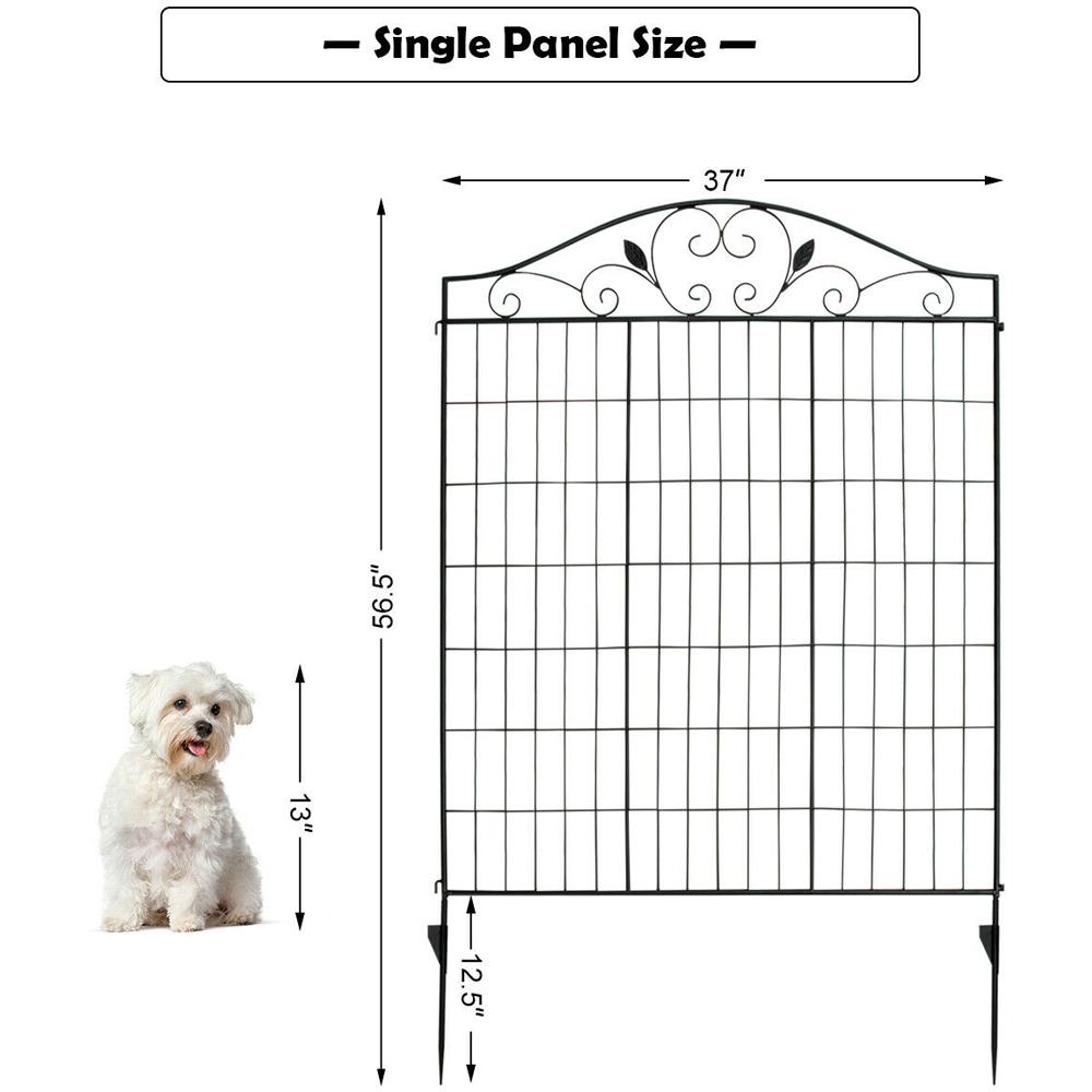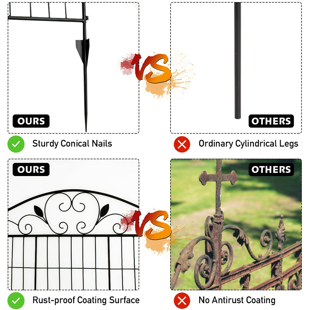 Create a beautiful boundary for your outdoor space with the Costway Folding Interlockable Garden Fence Panels 4 Pack. These iron fences can be deeply stuck into the soil to deal with the wind conditions. This rust-proof set of wire barrier fences is easy to install and set up without any digging messes. The extra-tall design copes with the harassment of medium size dogs. The tall height is useful for blocking most uninvited guests while the lightweight sectional design enhances your outdoor space while creating a border. It features artful patterns to bring elegant charm with an Interlockable design and is ideal for your patio, lawn or yard.