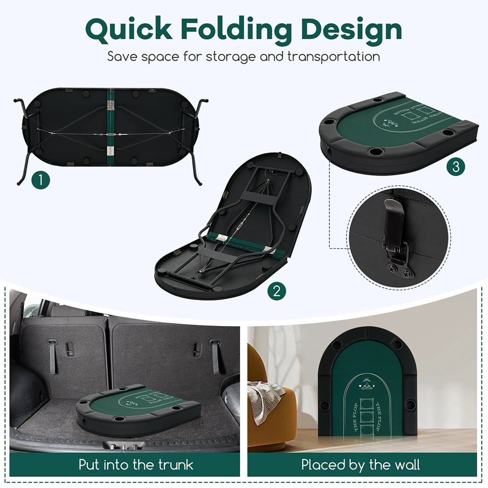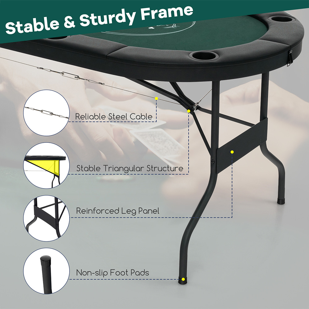 Elevate your game nights with the Costway Green 8 Player Foldable Poker and Card Game Table. It is designed for both intense card games and casual gatherings. This portable oval table not only provides a spacious gaming area that comfortably fits up to eight players but also features a quick foldable design for easy storage and setup. The luxurious padded railings and deeper metal cup holders enhance the comfort and convenience of your gaming experience. The casino-grade felt surface ensures a smooth, professional play area. Ideal for family nights, parties, or even outdoor events, this poker table is as versatile as it is functional. It measures 182 x 82 x 75 cm.