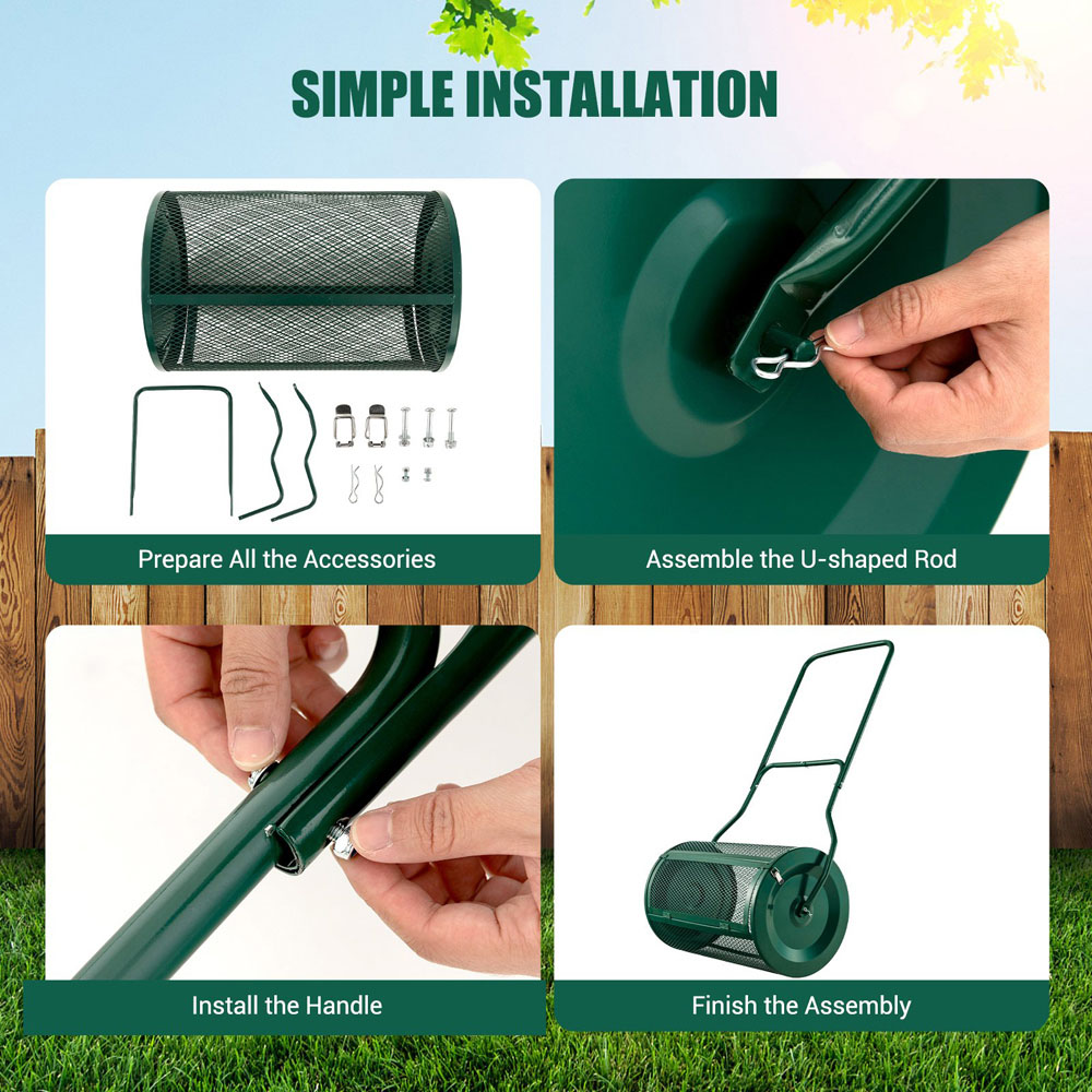Elevate your gardening game with the Costway Green Compost Spreader with Upgrade U Shaped Handle, Measuring 27-inch, it is designed to ensure your lawn remains forever fertile and evenly nourished. Say goodbye to the hassle of manual fertilisation and uneven distribution with this multifunctional garden spreader. It features a long metal mesh roller that effectively disperses top soil, while its large filling door and substantial capacity minimise refill frequency. The robust double-sided latches prevent damage during use, and the extended U-shaped handle promotes ease of operation without the need to bend. For added convenience, this durable all-metal spreader, finished in an attractive green, can be hung on the wall, saving valuable storage space.