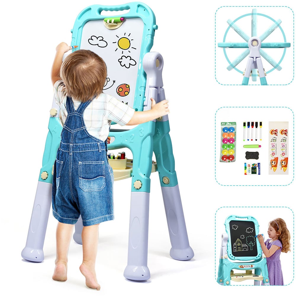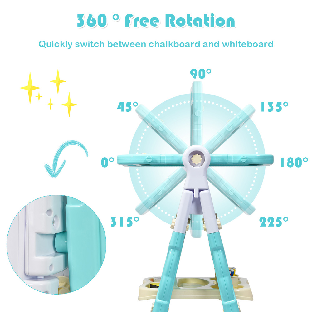 Make a delightful addition to your little one’s toy collection with the Costway Green Double Sided Board Easel. This art easel is a good gift for your little artist to release their talent for painting. It is equipped with a magnetic whiteboard and chalkboard and a 360° rotating design. It features two lengths of legs, allowing you to customise the art easel according to your child's height. The storage tray is spacious enough to place chalks, markers, erasers, magnetic beads and so on. The environmentally friendly PP material and stable triangular structure ensure good safety for children. The detachable drawing board with a handle allows them to carry it and draw anywhere. This double-sided board comes with an eraser, chalks, magnetic beads, markers, cups and a chalk cap.