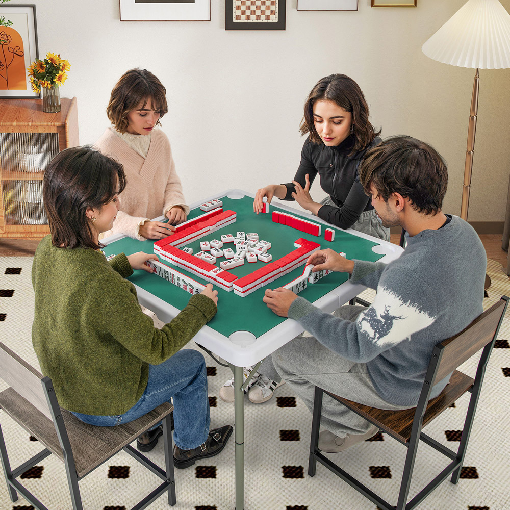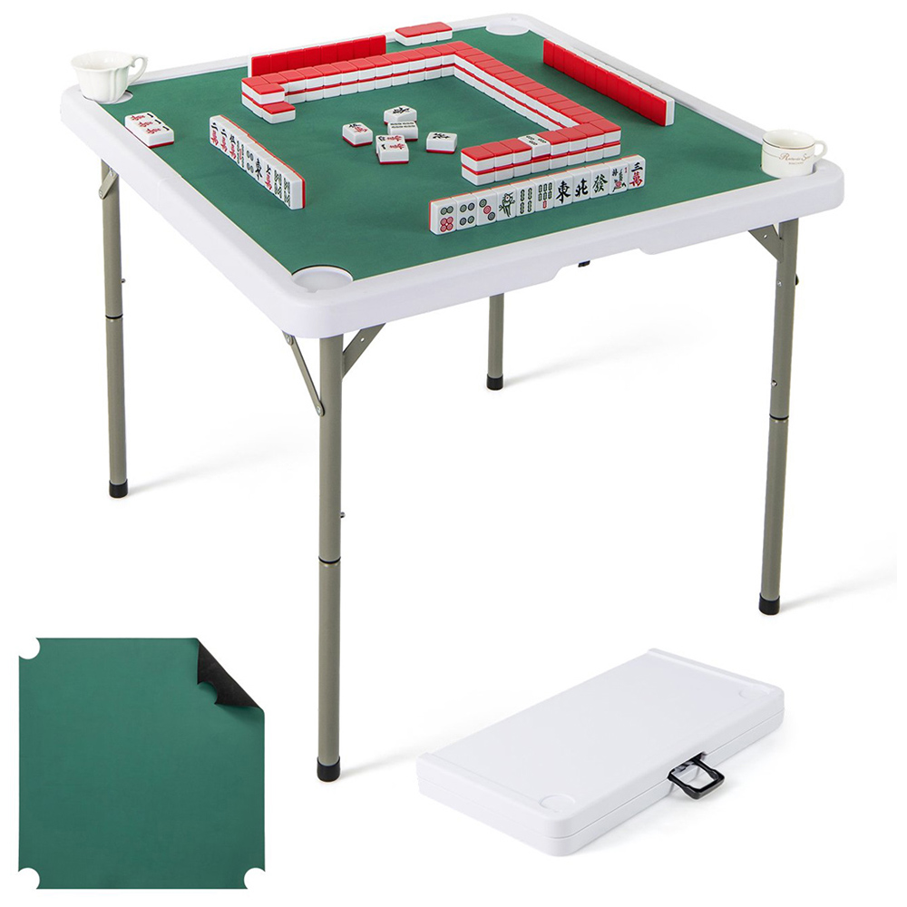 Bring the fun wherever you go with the Costway Folding Mahjong Table, featuring cup holders and a removable green game mat that ensures both comfort and convenience. Ideal for those who love to host game nights but are short on space, this table effortlessly folds into a compact form with a built-in handle, making it easy to carry and store. The spacious 90cm tabletop comfortably fits up to four players, and the noise-reducing mat, coupled with rounded corners, enhances the overall gaming experience. Constructed from durable HDPE and sprayed metal pipes, this table guarantees stability and longevity, making it perfect for various settings like family gatherings, outdoor picnics, or vibrant parties.