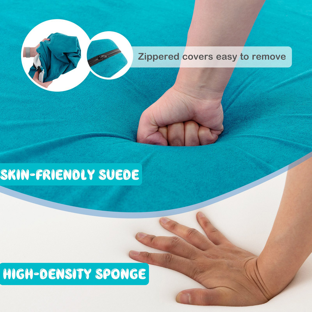 Give your child the gift of comfort and creativity with the Costway Green Kids Sofa Playset with Portable Handle 8 Piece. It includes two trapezoidal pillows, two rounded cushions, two rectangular cushions, a thick folding mat and a thin folding mat. These pieces can be arranged in endless ways, turning into a sofa, fort, tunnel, bridge, car, tent, slide, bed lounge or anything that your child’s imagination can create. Designed with safety in mind, this sofa is made from soft suede fabric and a high-density sponge, ensuring durability and comfort for children of all ages. The sponge is strong and elastic, providing a strong surface for crawling, jumping and resting without worrying about falls. It also has the capacity to withstand various adventure activities of children. This modular sofa set is not just for play as it also encourages creativity, imagination, logical capability and other potentials, helping to reduce screen time. Parents can even join in as well, making it a great way to bond with your children. Maintenance is easy with its removable and machine-washable soft suede fabric cover with zipper. The skin-friendly fabric is resistant to fading, shrinkage and shedding. Plus, the built-in handles make it easy to move around. Please note that if the set arrives compressed, simply unroll it and wait 48 hours for the foam to expand back to its original shape and thickness.