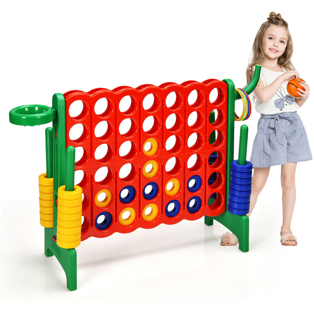 Elevate your game nights with the Costway Green and Red Giant 4 In A Row Connect Game Set with 42 Rings. This is a larger-than-life version of the classic strategy game that promises to engage both kids and adults alike. This set not only offers the traditional connect-four challenge but also includes basketball and ring toss games for varied fun. Constructed from premium PP and PE materials, it ensures safety, durability, and non-toxic play, making it an ideal choice for family gatherings, parties, and outdoor activities. The jumbo set is lightweight and can be assembled quickly without tools, making it easy to transport and set up anywhere you want to bring the fun.