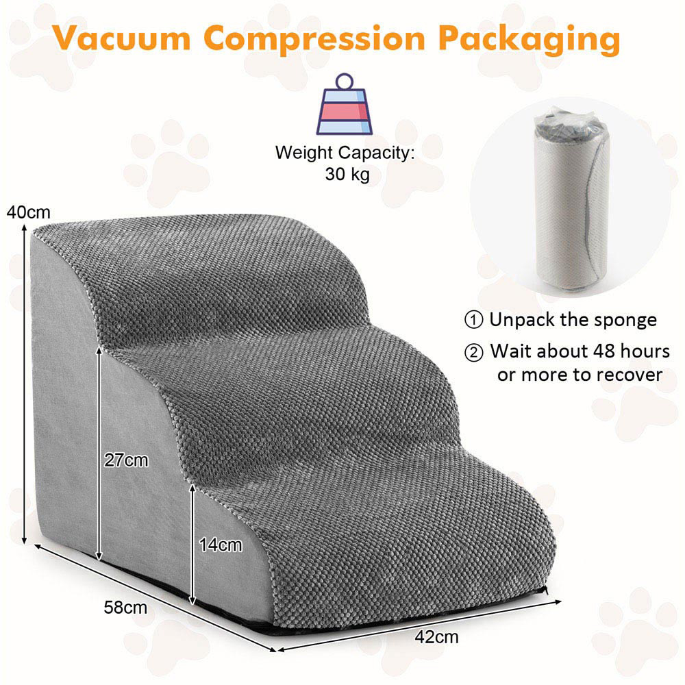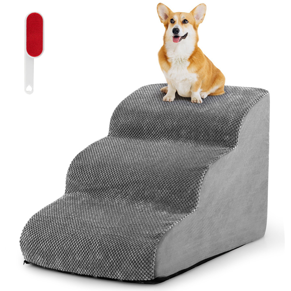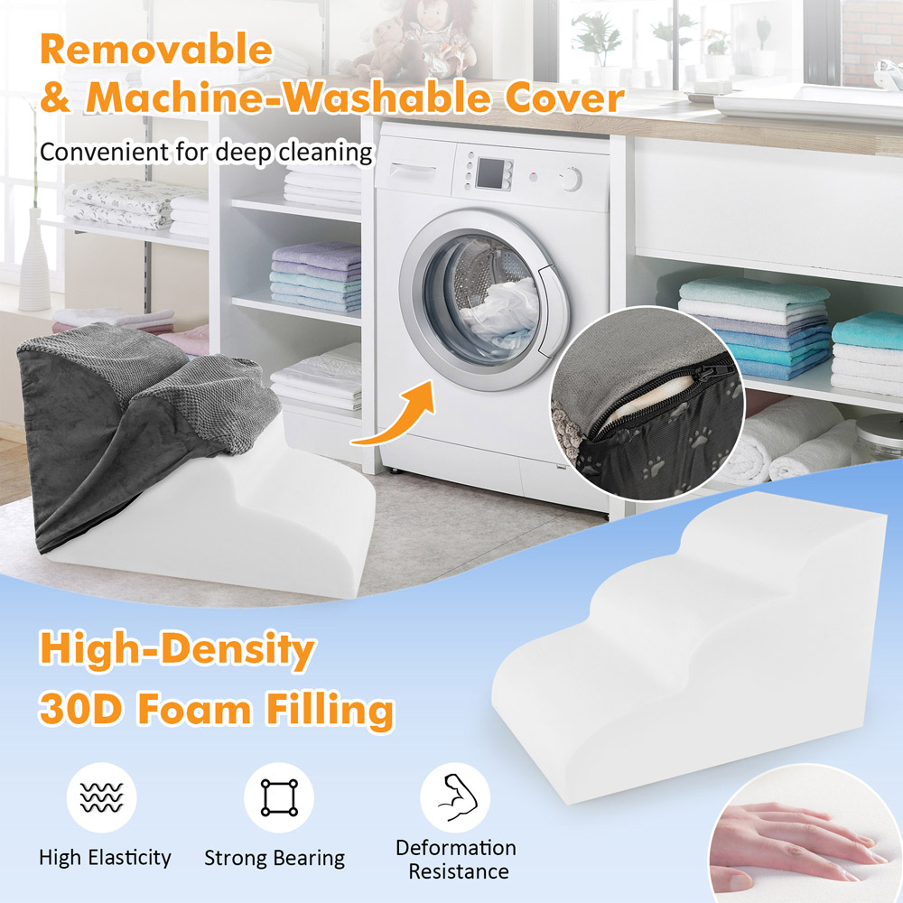 Enhance your pet's mobility and comfort with the Costway Grey 3-Tier Foam Dog Ramp, designed specifically for small dogs and pets with mobility impairments. This ramp is a must-have for those looking to ease the strain on their pets' joints, featuring a gentle slope and three wide, deep steps that make climbing up and down from furniture like beds and sofas a breeze. Its high-density foam construction ensures a soft yet robust support, while the non-slip corduroy fabric cover increases safety by preventing slips. For added convenience, the cover is removable and machine washable, making it easy to keep clean. The ramp also includes a handy pet hair remover brush, ensuring your home and the ramp remain hair-free.