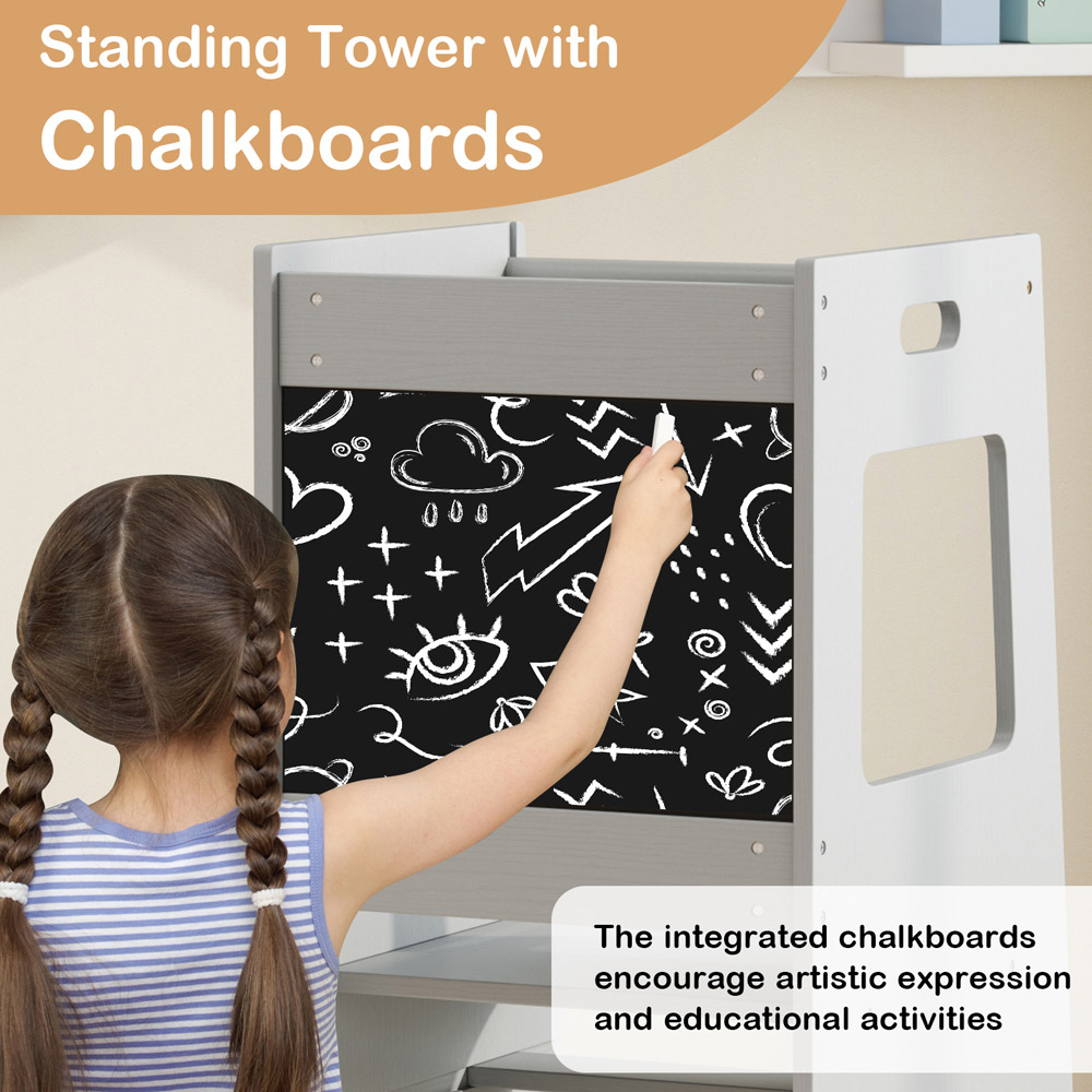 Boost your toddler's kitchen adventures with the Toddler Kitchen Step Stool with Activity Chalkboard and Adjustable Height in a sleek grey finish. This versatile step stool not only helps your little one reach countertops and sinks safely, thanks to its 2-level adjustable platform, but it also sparks creativity with its integrated chalkboards. Perfect for jotting down recipes or drawing, it turns kitchen time into fun learning experiences. Crafted from solid wood with robust safety features such as an anti-fall rail and rounded edges, it supports up to 60kg and complies with ASTM and CPSIA standards. Easy to move and adjust, it's more than just a step tool; it's an engaging activity centre that promotes independence and learning in various environments.