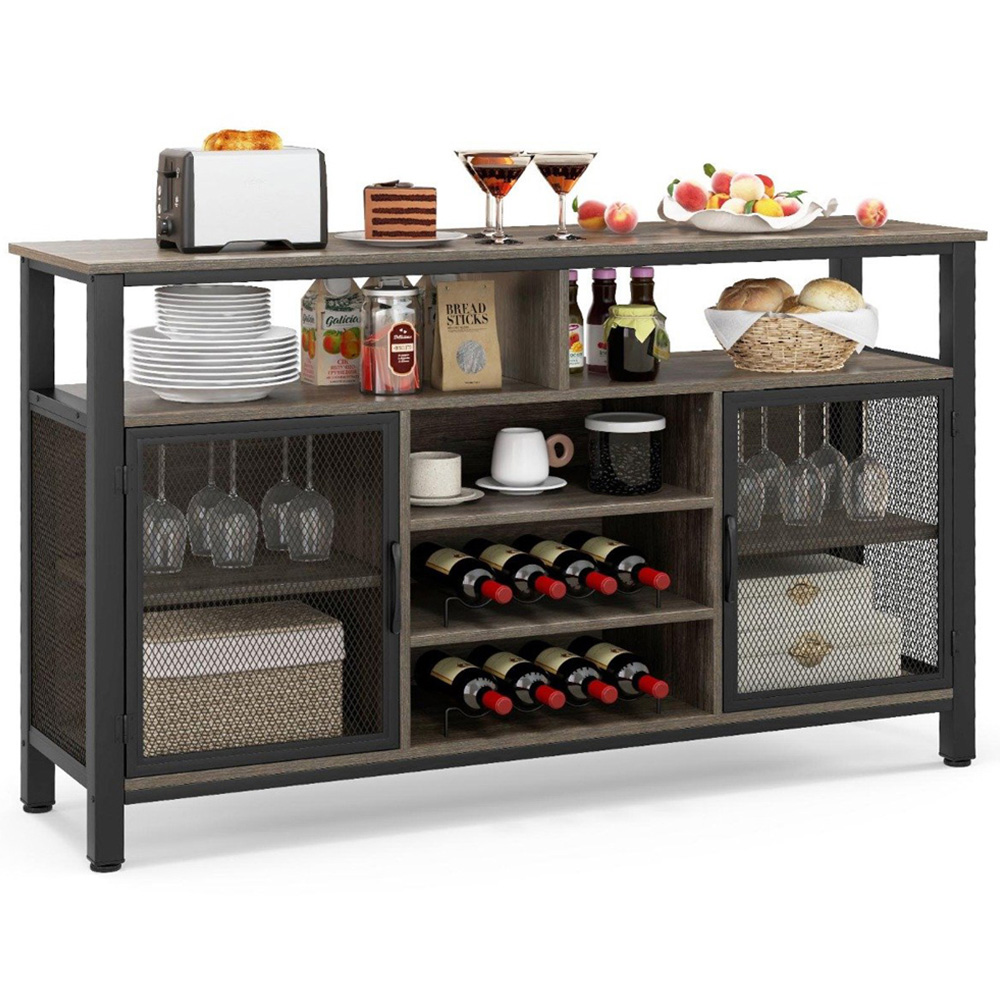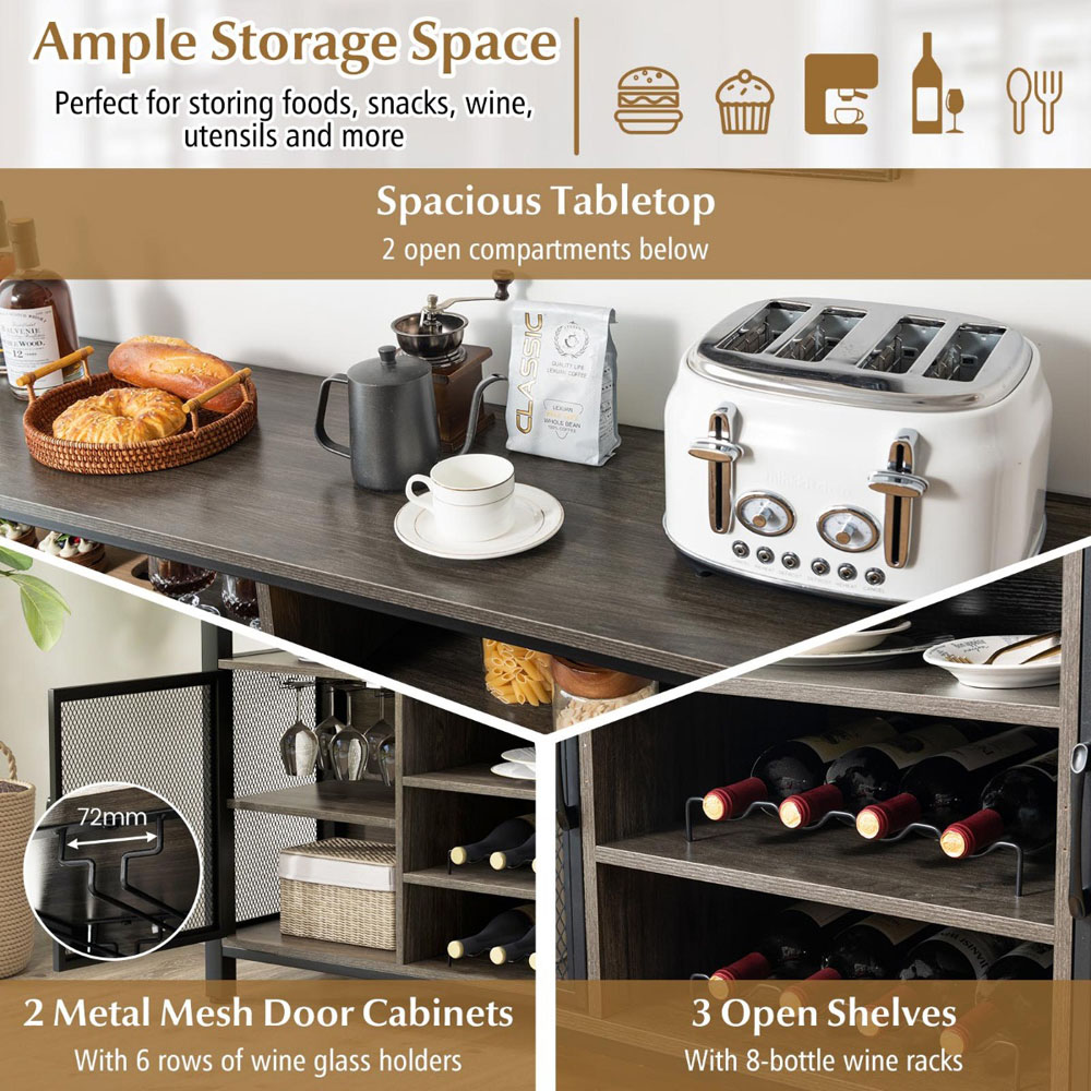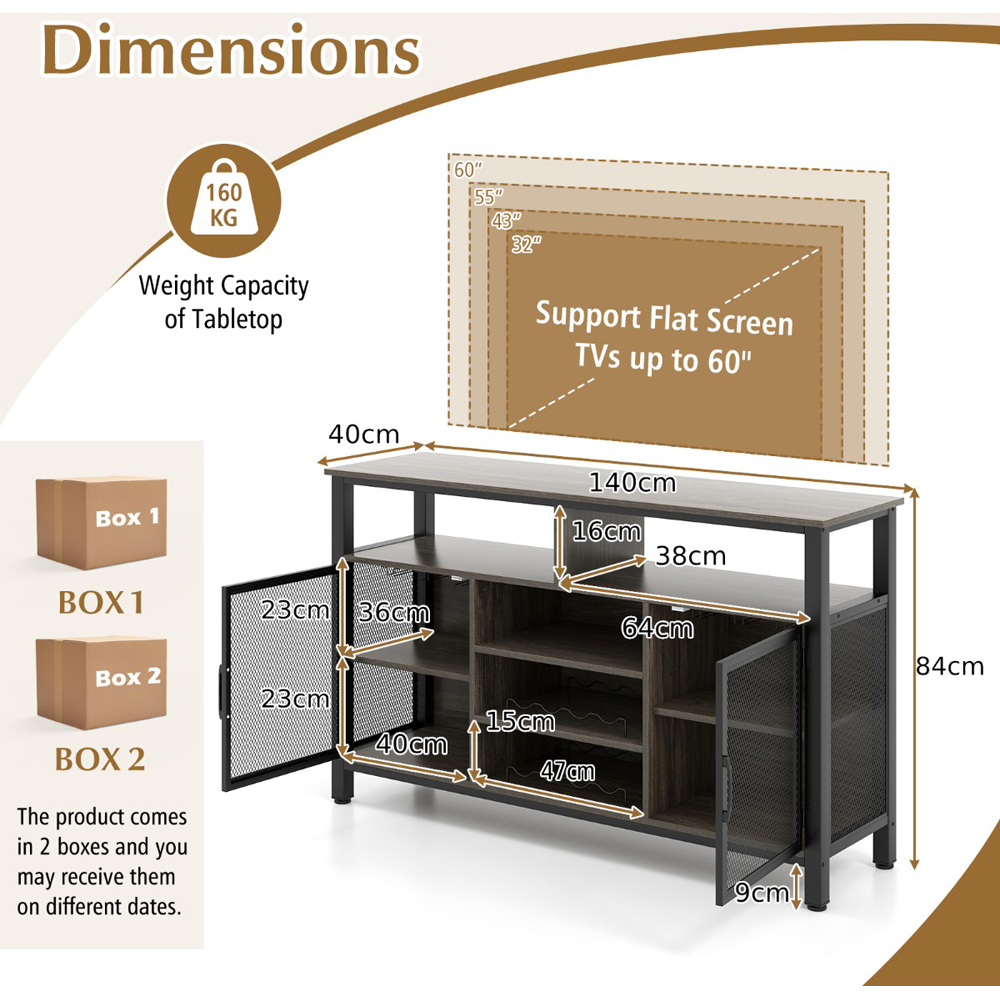 Introducing the ultimate organiser for wine enthusiasts and kitchen gurus alike - this 140cm wine bar cabinet! Designed to captivate and impress, this versatile storage solution effortlessly showcases your wine collection, accommodating up to eight bottles with style. With six rows of wine glass holders, your precious stemware is elegantly displayed and easily accessible. But that’s not all! This extraordinary cabinet boasts many other storage options to ensure every kitchen essential finds its rightful place. Crafted with a heavy-duty metal frame, this storage cabinet stands sturdily. Anti-tipping kits enhance the overall use safety and provide better protection for your family. Wait, there’s more! Transform this marvellous piece into a stunning TV stand for your flat screen up to 60". The user-friendly design, like the mute hinges, gives you a better experience. Elevate your organization game today with our coffee bar cabinet! This wine bar cabinet is equipped with eight-bottle wine racks and six rows of wine glass holders, providing ample space to store and display your favourite bottles of wine and stemware. Keep your collection organised and easily accessible. The buffet sideboard provides you with a spacious tabletop, a two-partition open shelf, two metal mesh door cabinets and three open shelves, which is great for kitchen essentials. The large coffee bar cabinet is constructed with a heavy-duty metal frame for long-lasting durability. Together with two anti-tipping kits and four adjustable foot pads, the cabinet is not likely to wobble or tip over. Not only does this unit serve well as a liquor cabinet, but it can also be used as a TV stand that holds flat screen TVs up to 60inch. Its wide and flat tabletop is supported by an extra panel for reinforced load bearing capacity. This kitchen storage cabinet comes with all the necessary hardware and tools for easy assembly. The clear instructions guide you through each step, making the process quick and hassle-free.