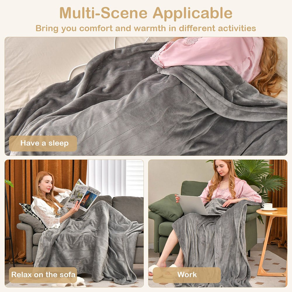 Sooth your body and mind with the ultimate warmth of the Costway Grey Electric Blanket with 4 Heat Settings 180 x 130cm. This blanket features high-efficiency and instant heating that quickly drives away your coldness. With four heating levels, you can easily choose the temperature you need as per your preferences. Both sides of this heating blanket are crafted from high-grade flannel, providing high-level comfort and stable heat conduction. Plus, the heating wire in the middle is up to 25mm long, offering better heating efficiency. For more convenience, the blanket includes an easy-to-operate remote control, letting you adjust the heating level smoothly. In addition, it is designed with eight-hour auto-off and overheat protection features to offer maximum safety. Measuring 180 x 130cm, this electric heated blanket is suitable for multiple occasions, whether you are sleeping, relaxing on the sofa or working. This blanket is both hand and machine-washable, maintaining its softness for longer and saving your effort. Just remember to unplug the power connection and disconnect the cord before washing. Please note that it is recommended to wash in cold water only and do not use until it is totally dried.