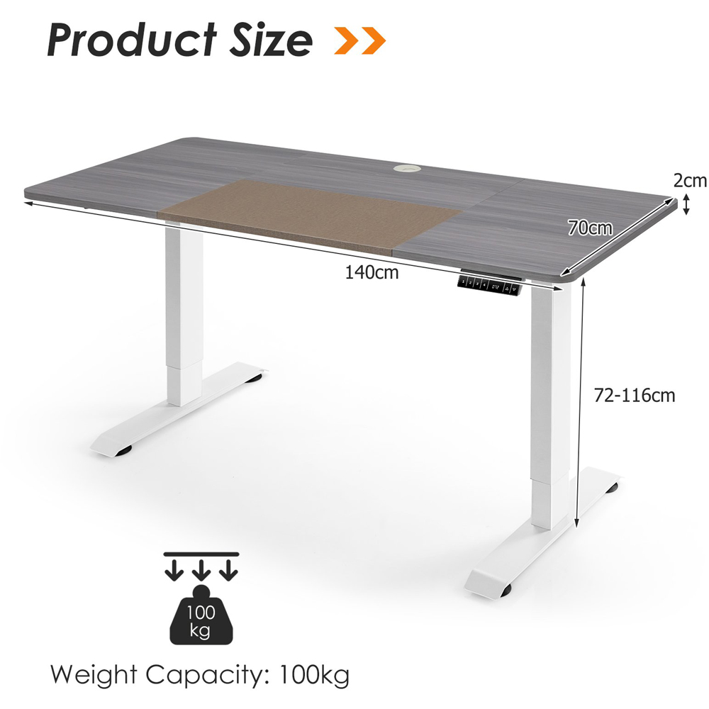 Elevate your workspace with the Costway Grey Electric Height Adjustable Standing Desk. This desk features an easy-to-use button controller that lets you adjust the desktop height between 72 and 116cm, allowing you to alternate between sitting and standing. With its smart controller, you can program and save different heights tailored for various activities, from work to leisure. The spacious tabletop, crafted from thickened particle board, provides ample room for multiple monitors and office essentials, while the robust steel frame ensures durability and stability. Additionally, designed to enhance your productivity and well-being, the desk includes safety features such as anti-collision technology and overload protection, making it a reliable choice for any modern office.