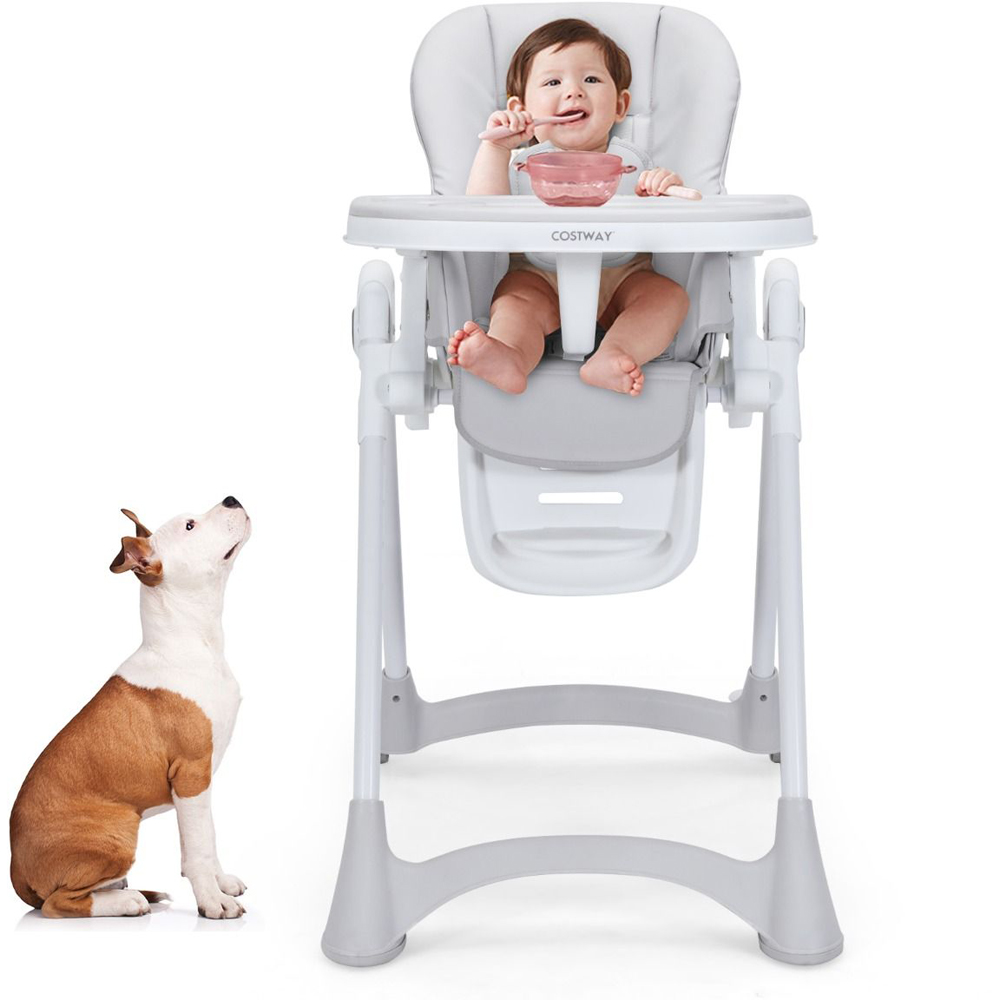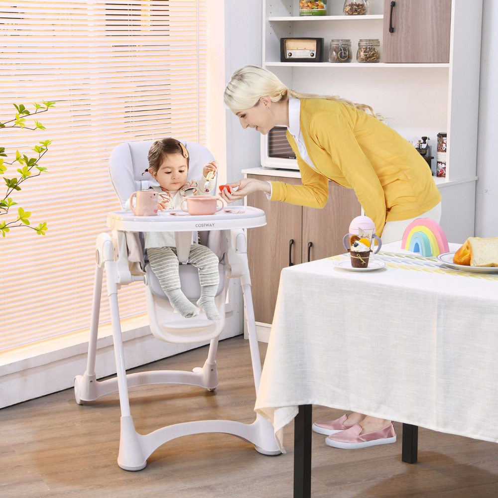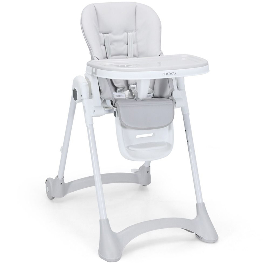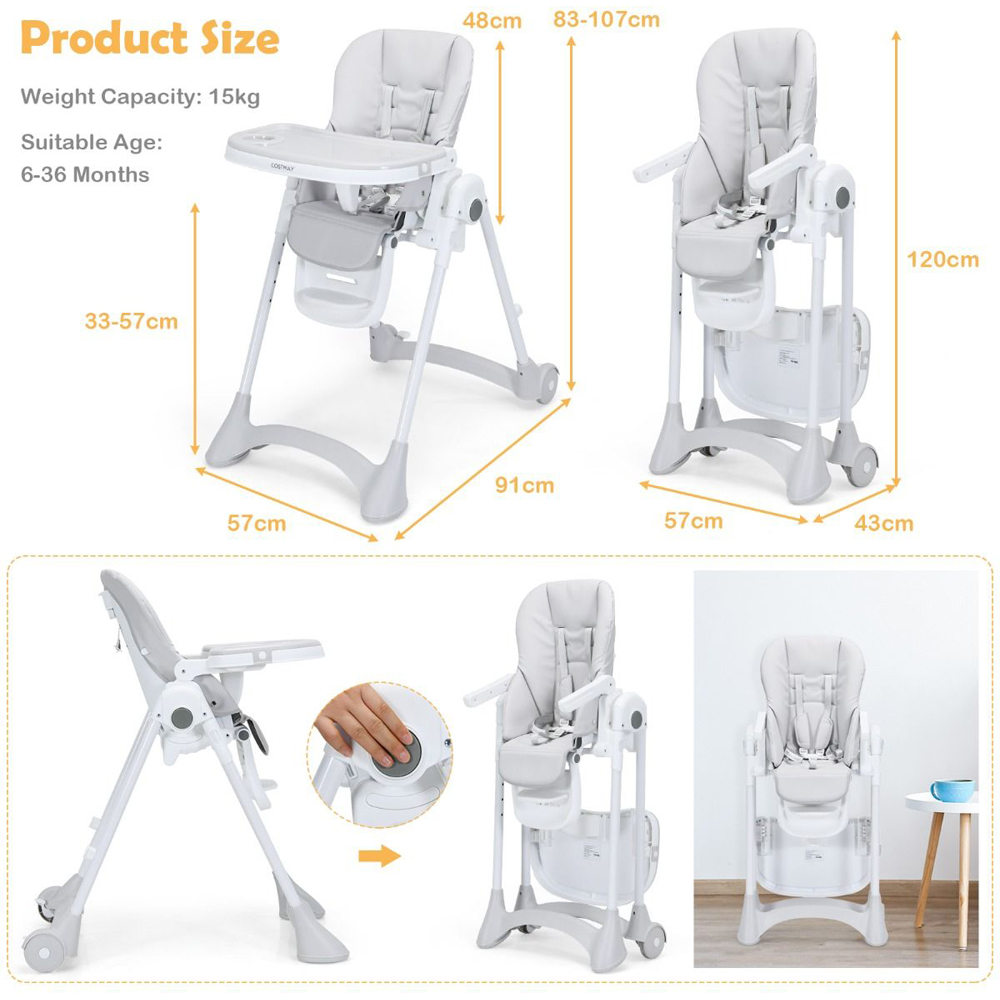 Add functionality and comfort with the Costway Grey Folding Baby Highchair. This adjustable baby highchair can perfectly fit toddlers of different ages, especially those who are very active. This highchair provides effective protection to keep your baby in a safe condition on various occasions. This high chair is also easy to clean, allowing you to maintain it for longer time use. Foldable design helps save plenty of space. This baby high chair features 5 backrest angles, 6 seat heights and an adjustable footrest, providing flexible and free space for babies of different heights and ages. Mom can easily find the most suitable position for your little ones and let them sit and move comfortably. This chair is constructed of a sturdy iron frame to ensure durability. With a pyramid structure and strong base support, your baby can enjoy enhanced stability for versatile activities. The 5-point harness belt and safety baffle will firmly fix your baby and prevent falling. The high chair for toddlers is equipped with double removable trays, which are adjustable in 3 positions to customize to baby’s growth while also being washable for easy cleaning. Meanwhile, the high chair has 2 lockable and smooth rear wheels, making it easy to move. This foldable high chair is equipped with a removable PU cushion, which is flame-retardant and breathable to ensure a safe and comfy experience. Moreover, the trays are made of non-toxic and odourless PP material to create a safe eating or playing environment. It requires a simple installation and you can refer to the clear manual to save time. When not in use, you can fold it into a compact size and easily store it in a narrow corner.