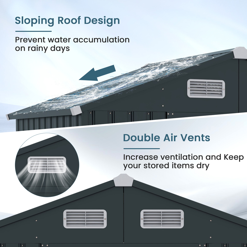 This Costway Grey Garden Storage Shed is designed to serve as a tool room, utility room, garbage house, or pet shelter, effortlessly catering to your backyard, farm, or garden requirements. Thanks to its sloping roof design and double air vents, preventing water accumulation and maintaining optimal ventilation, your stored items remain dry and well-protected, even on rainy days. Besides, with a stable and sturdy frame constructed from rustproof galvanised steel, reinforced by robust roof beams, an anti-collision cover, and reinforced triangle anchors, this storage shed prioritises the safety and security of your belongings. The smooth sliding doors, convenient door handles, and innovative groves ensure easy access and enhance the overall convenience of use. Additionally, the shed's large capacity of 3.25m3 provides ample space for storing pool equipment, tools, bicycles, and lawnmowers. If you are looking for such a product, do not hesitate to buy it! This multipurpose shed serves to accommodate pool equipment, tools, bicycles, and lawnmowers. It can be used as a tool room, utility room, garbage house, or pet shelter effortlessly. Thanks to the sloping roof design and four air vents, this garden tool shed prevents water accumulation and maintains optimal ventilation to keep your stored items dry. Hence, it can offer ideal protection for your items even on rainy days. The rustproof galvanised steel frame, reinforced by robust roof beams and anti-collision cover, ensures the safety and security of your belongings. Plus, it also features reinforced triangle anchors for ultimate stability. The smooth sliding doors and convenient door handles of this storage shed offer easy access for seamless entry and exit. Additionally, it also comes with a pair of gloves for your convenience. Measuring 193 cm x 129 cm x 197 cm, this garden storage shed offers a large 3.25m3 for all your needs. Note: All necessary accessories are shipped separately in two boxes and the time of receipt may vary.
