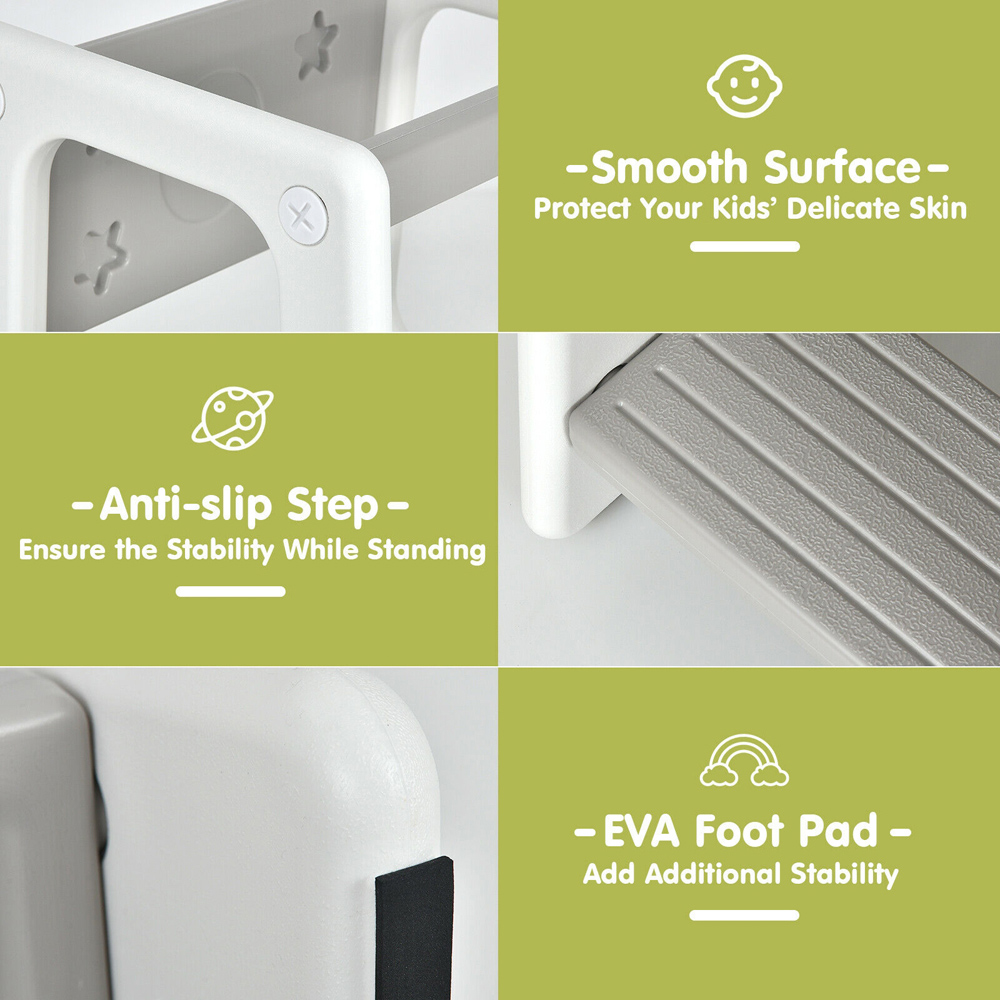 Make the most of family time with the Costway Grey Kids Adjustable Non-Slip Kitchen Step Stool. This toddler tower has three adjustable heights and is designed to grow with your kids. It allows children to participate in various activities like cooking, washing hands, and brushing teeth with you. The toddler stepping stool encourages hands-on learning and strengthens the parent-child bond. It is equipped with double safety rails and anti-slip EVA foot pads to ensure your kids' safety and stability. The stool can be adjusted to three different heights and can support weights of up to 65kg, accommodating kids from 18 months to 60 months. As your kids grow, you can remove the safety rails to convert them to a standing platform or a kid's stool. Made of odourless HDPE material, it is safe for kids and easy to move around. The installation is simple, with clear instructions and included accessories.