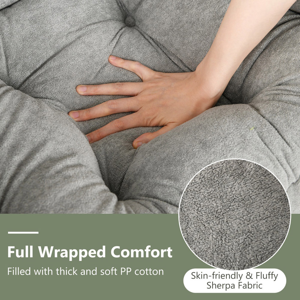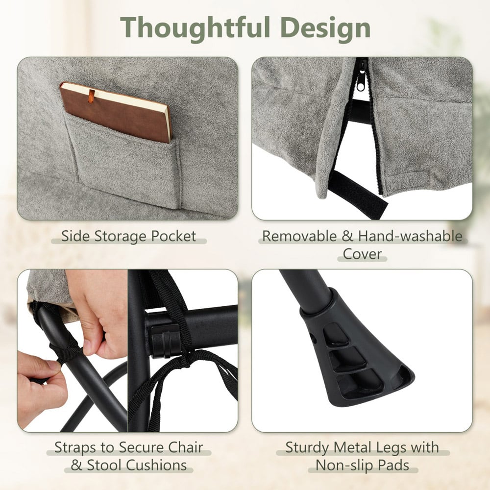 Sink into the epitome of comfort with This grey Sherpa lounge chair, complete with a foldable footrest and handy side pocket. This oversized accent chair is designed to provide a luxurious and spacious seating experience. The foldable ottoman, featuring a double-sided cushion, offers versatile comfort and convenient storage options. Crafted with sturdy metal legs and non-slip pads, this chair ensures stability and floor protection. The side storage pocket adds a practical touch, making it easier to keep essentials like books and remote controls within reach. Ideal for any room needing an extra hint of cosiness, this chair is perfect for a variety of activities, from reading to relaxing.