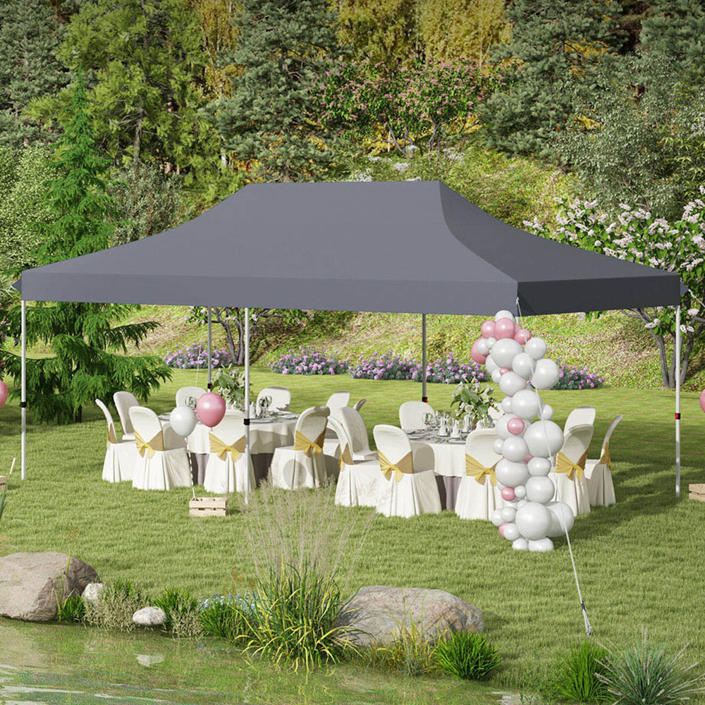 Turn any outdoor event into a grand occasion with the Costway Grey Pop-up Canopy Tent with Carrying Bag 300 x 600cm. This pop-up canopy tent is supported by a rustproof powder-coated metal frame, ensuring good sturdiness and long-lasting durability. Moreover, with its wind rope and stake fixation and metal foot pad and stake fixation, the canopy offers excellent stability, even in windy conditions. The canopy is crafted of durable and water-repellent Oxford fabric, ensuring reliable protection against rain. Furthermore, the canopy fabric with silver coating can block up to 99% of harmful sunlight, providing superior UPF50+ sun protection. Besides, it features a 3-level adjustable height (296/306/316 cm), allowing you to customise the canopy to your desired height and create the perfect outdoor space for any occasion. The large outdoor canopy tent can comfortably accommodate 15-20 people, making it perfect for various outdoor activities. The canopy tent can be effortlessly folded into a small size. Plus, it is designed with a portable carrying bag, making storage and transportation a breeze. Given the hassle-free pop-up design, this outdoor instant shelter is easy and quick to set up and take down, requiring no tools. Whether you're hosting a backyard party, holding a wedding ceremony, setting up a booth at a trade show, or organising a community event, this canopy has got you covered. Please ensure to use stakes and wind ropes to secure the canopy and avoid using the tent in adverse weather conditions, especially during high winds.