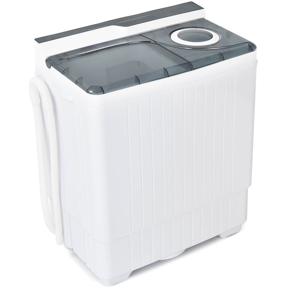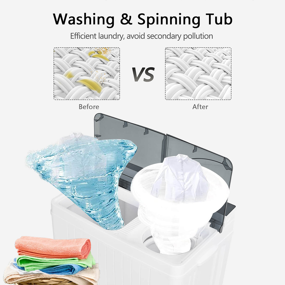 Elevate your home's functionality with the Costway Grey Portable Twin Tub Wash Machine with Spin Dryer. This washing machine has a twin tub design, allowing for concurrent washing and drying of clothes. The washing and drying functions can also be used independently, providing added convenience for your laundry needs. This makes it a great choice for saving time and effort. The machine comes with a timing function and three selection modes. The control panel offers 15 minutes of washing time and five minutes of spinning time. You can easily choose the appropriate time by rotating the timer knob. You can select the wash, spin, or drain mode based on the type of garments being washed. With a 6.5kg capacity for the washing tub and a 2kg capacity for the spin tub, the machine can handle a large quantity of clothes, making it suitable for daily household use. It can accommodate several items, including larger garments like jeans or bed sheets. You can add clothes and detergent and set the appropriate washing cycle. The washing machine features a powerful 280W motor for washing and a 140W motor for spinning, ensuring effective performance. It also comes with a built-in drain pump, allowing for easy drainage of dirty water after each wash. Its compact and portable design, along with a clear washer lid, makes it suitable for various settings, such as dorms, apartments, RVs, camping trips, or any space with limited room. Additionally, the plastic material used in its construction prevents rusting in wet environments.
