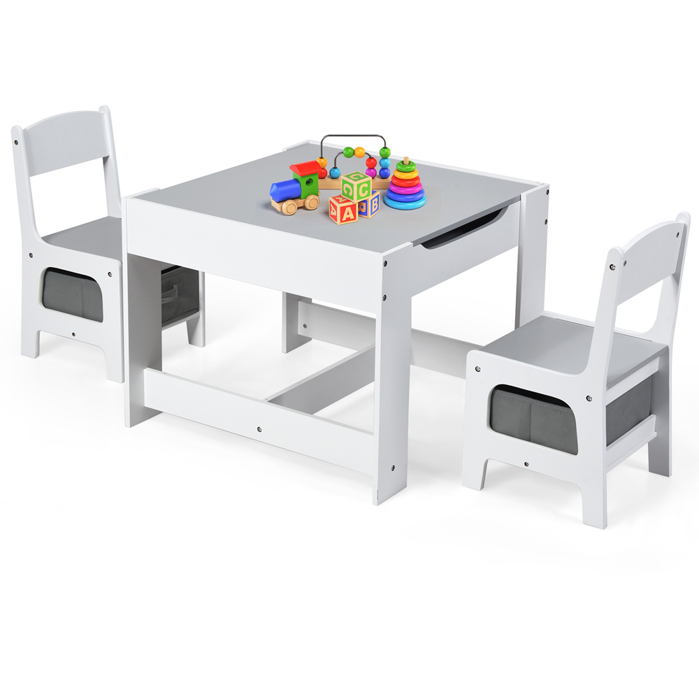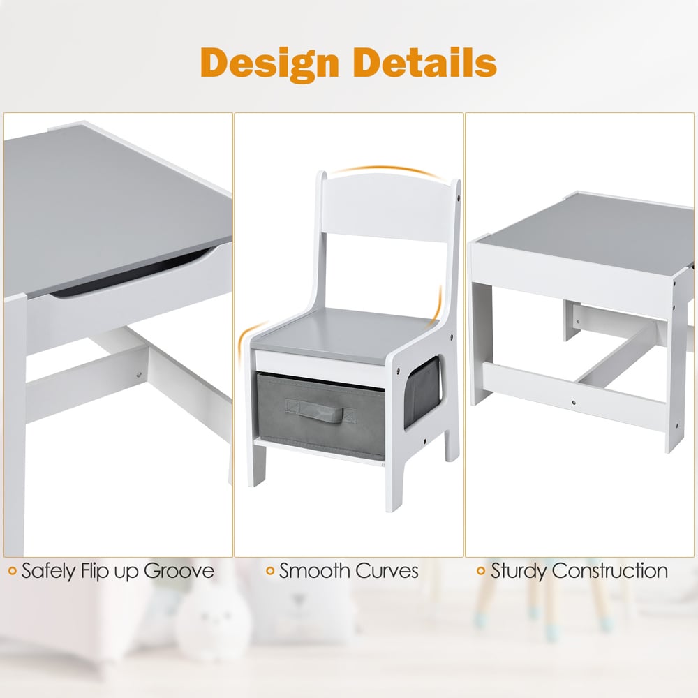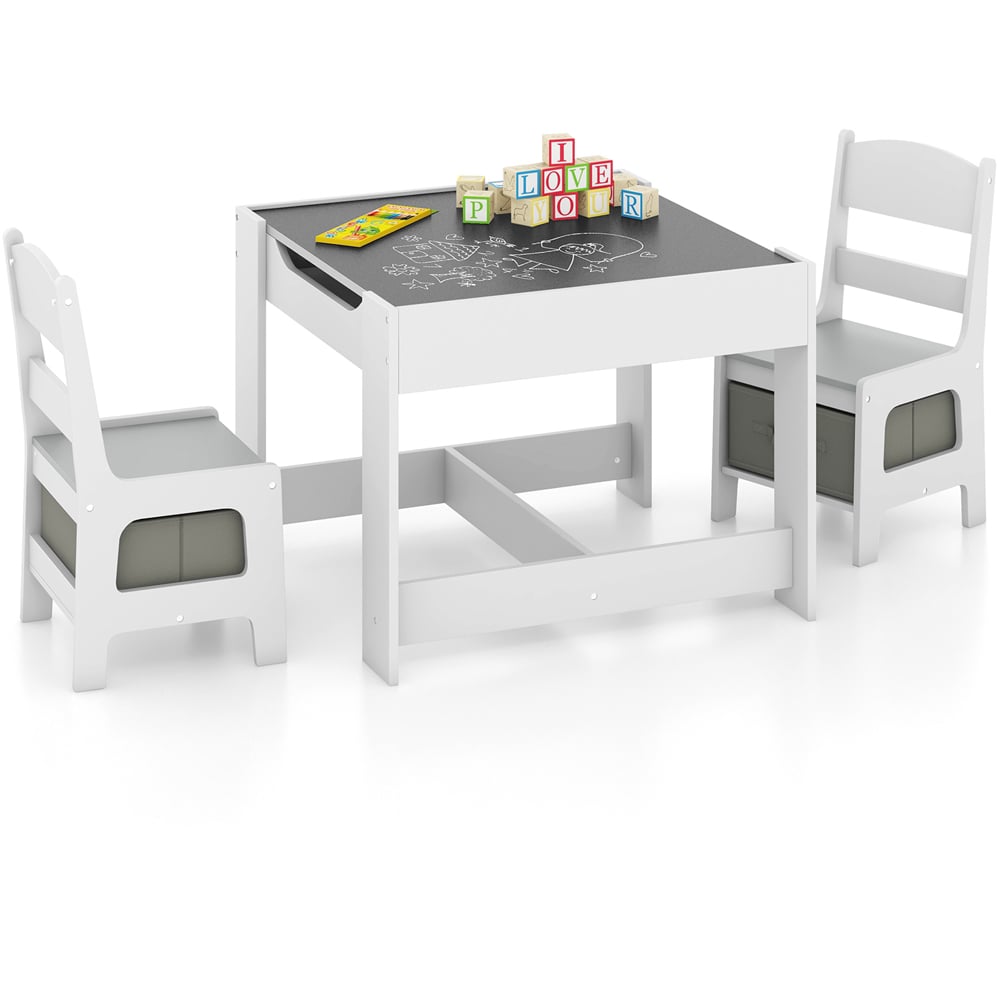 Make an adorable addition to your little one’s room with the Costway Grey Table and Chair Set with Storage Boxes. The double-sided tabletop offers a chalkboard side, allowing children to draw or colour on it, while the white and grey side is suitable for playing. There is a small space suitable for storing pens, chalk and paper under the tabletop. The table has a central footrest for children to rest their feet while doing their activity. Each chair has an ergonomic backrest and specially designed fabric drawer suitable for storing toys and books, encouraging children to tidy up after play. It is made from high-quality MDF and coated with non-toxic paint for durability and longevity. Suitable for children between the ages of three to seven years.