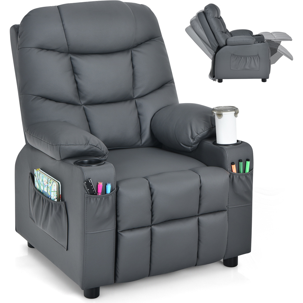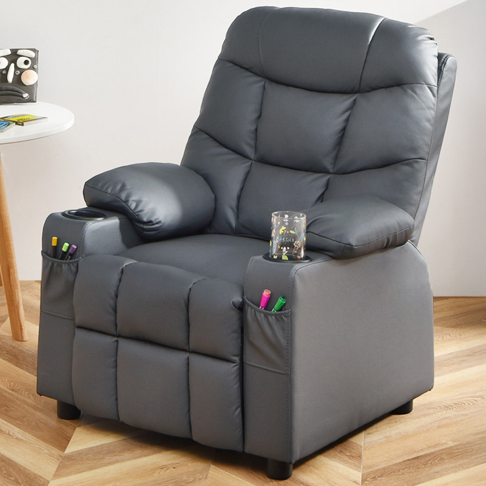 Elevate your child's comfort with this multifunctional grey upholstered recliner chair, designed to cater to their reading, napping, and TV watching needs. With its easy-to-adjust backrest and footrest, this chair transitions smoothly between different positions, ensuring optimal comfort at all times. The waterproof PU leather and sturdy solid wood frame, combined with thick sponge padding, make it durable enough for long-term use while providing a plush seating experience. The ergonomic high backrest and wide armrests enhance comfort, and the built-in cup holders and side pockets add a touch of convenience by keeping essentials within easy reach.