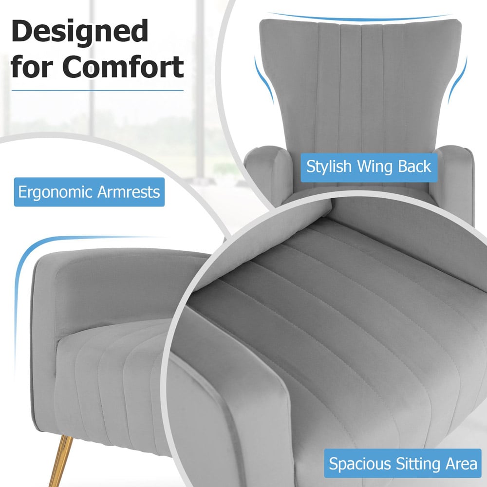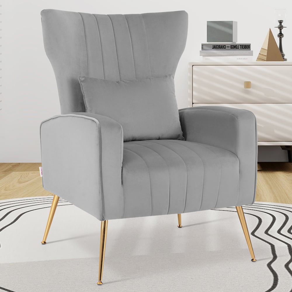 Enhance your furnishings with the Costway Grey Velvet Upholstered Wingback Chair with Lumbar Pillow. This wingback accent chair is designed with an ergonomic wingback, curved armrests, and a spacious seat that conforms to your body's contours. It comes with a removable lumbar pillow that offers tailored support for your waist. It creates a relaxing space for activities like reading, watching TV, playing games, or simply unwinding. The chair is made of skin-friendly Dutch velvet fabric and features high-density sponge cushioning for added comfort. The S-shaped springs ensure durability and long-lasting support. The chair's metal legs have a lustrous golden finish and adjustable foot pads for stability, with a weight capacity of 180kg. This modern wingback chair complements contemporary and traditional settings, making it a versatile addition to your living room, bedroom, reception room, or reading nook. It requires minimal assembly, with only the attachment of four legs and the placement of the backrest and lumbar pillow.