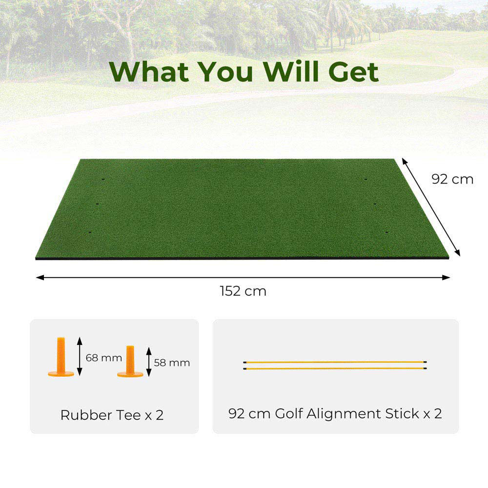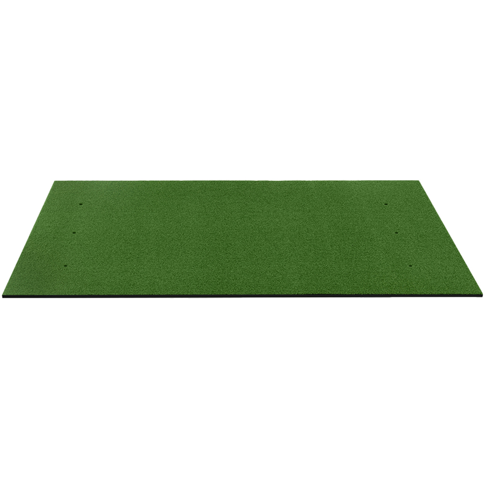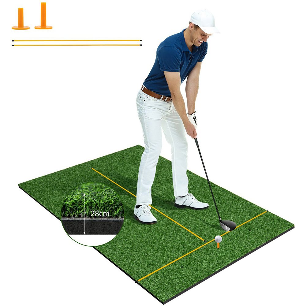 Elevate your golf practice with the Costway Indoor and Outdoor Practice Golf Hitting Mat 32mm, perfect for both indoor and outdoor sessions. This mat measures 5 x 3 ft and features a 32 mm thickness, providing a substantial surface to emulate a real golf course environment. The synthetic grass top layer offers an authentic fairway feel, while the gel-filled middle layer and non-slip EVA foam base ensure a stable and consistent experience during each swing. Equipped with two directional indicator poles and six tee positions, this mat caters to both right and left-handed golfers, enhancing alignment and swing precision. Whether in your living room, backyard, or at a golf course, this portable and easy-to-store mat is an excellent aid for any golf enthusiast looking to improve their game.