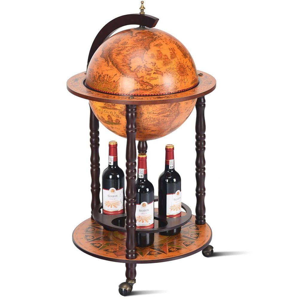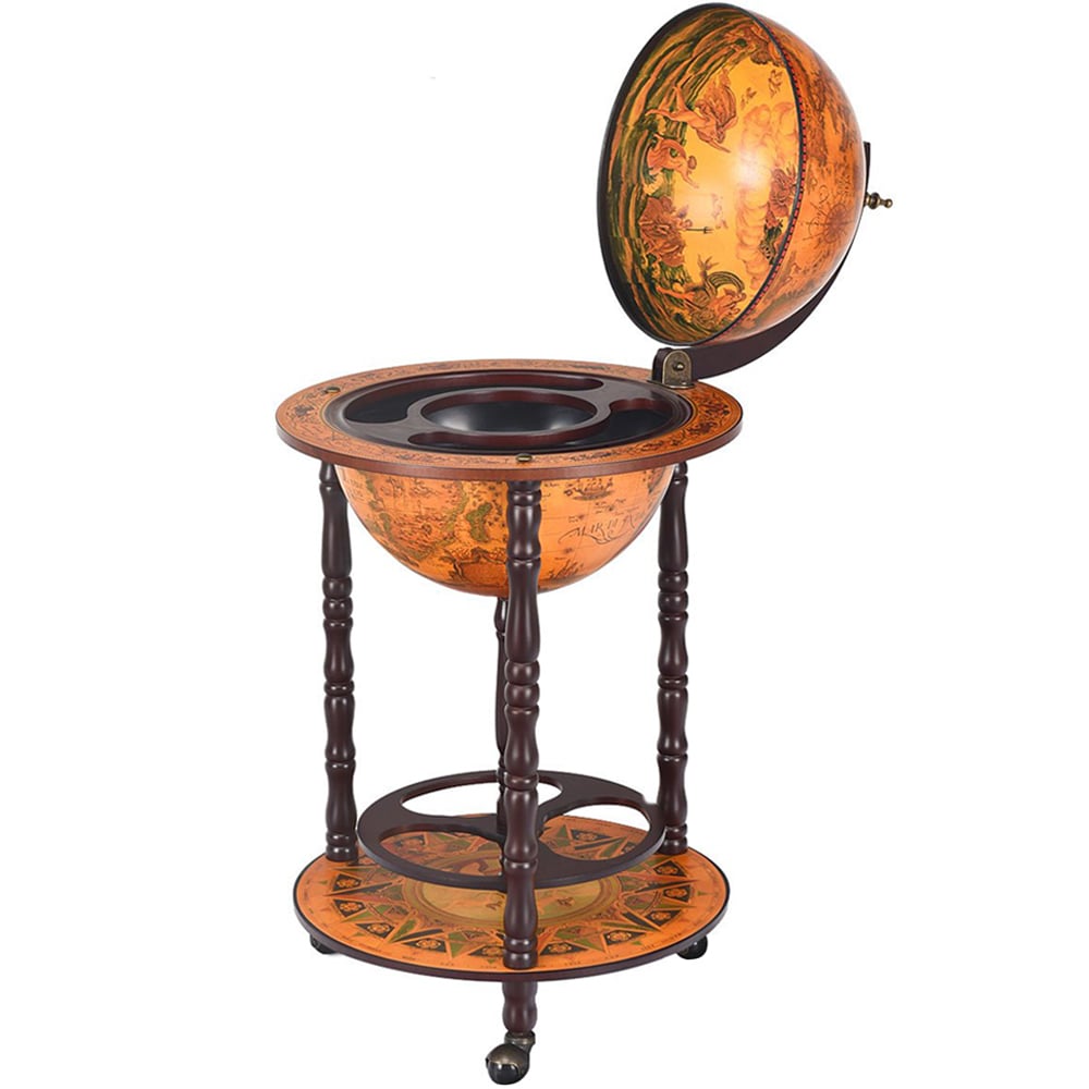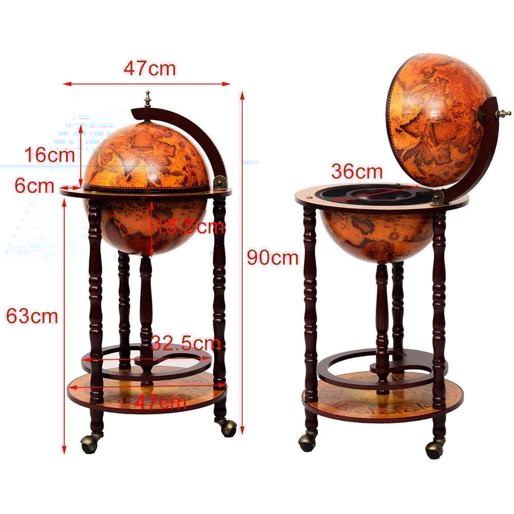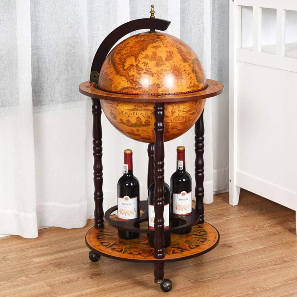 Transform your space with the Costway Italian Styled Globe Drinks Cabinet with Wheels, a perfect blend of functionality and old-world charm. This rolling compact cart not only keeps your wine and spirits neatly organized but also adds a touch of elegance to any room with its vintage map design and exquisite craftsmanship. Made from solid eucalyptus wood and premium plastic, it offers durability and easy mobility, ideal for use in various settings including offices, kitchens, and lounges. Its two-tier storage system and additional bottom shelf ensure ample space for an array of bottles and glasses, while the smooth-rolling wheels allow for effortless relocation without scratching floors. Easy to assemble and clean, this globe drinks cabinet is a stylish yet practical addition to your home.