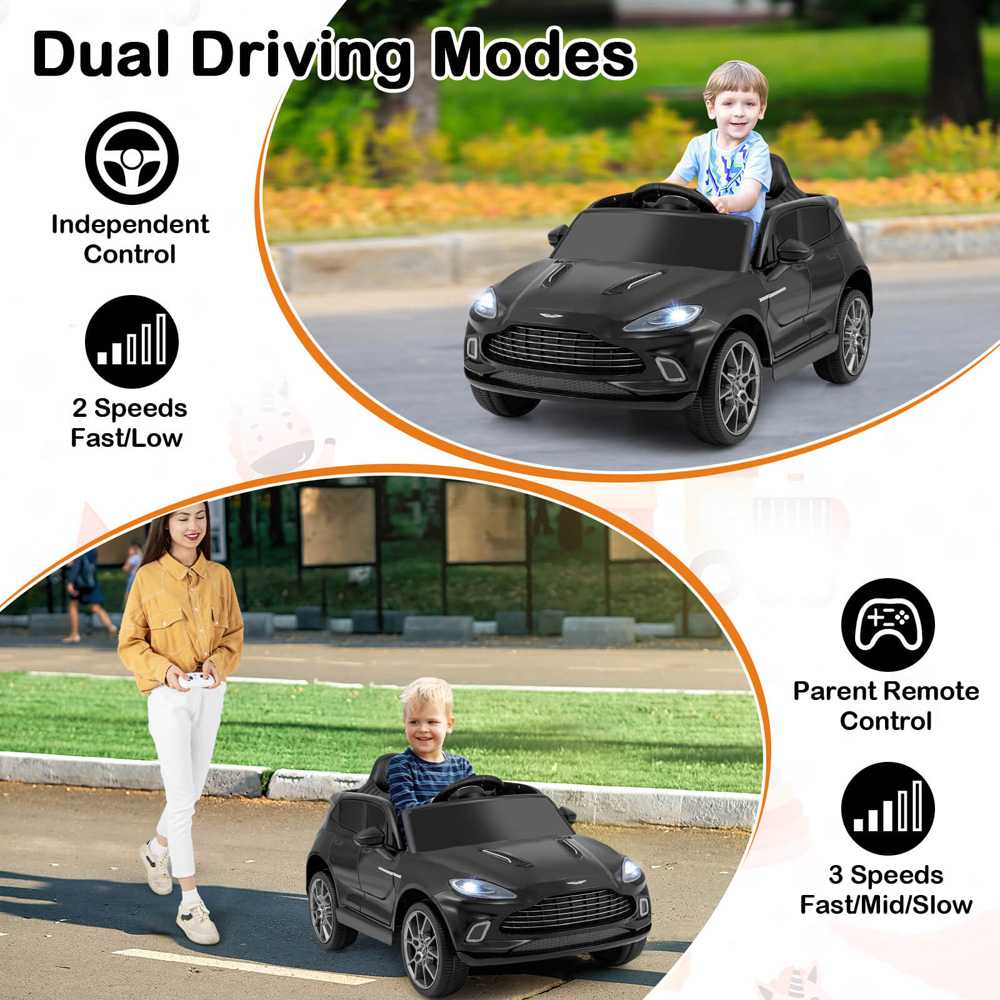 Invite excitement into every adventure as your young explorer takes the wheel of a 12V ride on vehicle with realistic features, crafted with a sleek Aston Martin-inspired design in bold black. Powered by a robust 12V battery and dual motors, children can enjoy smooth rides at a safe speed range, whether cruising on the pavement or tackling outdoor terrain thanks to large all-terrain tyres and shock absorbers. Flexible driving options let children steer themselves or parents take control via remote. Built-in horn, taillights and music system add extra fun and authenticity to every journey. With its easy-pull handle and foldable wheels, moving the vehicle is effortless, making playtime as convenient as it is exhilarating.
