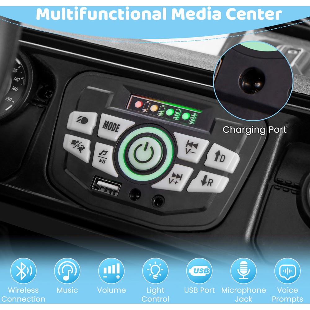 Spark young imaginations with the 12V black electric ride-on truck, letting children cruise in style while enjoying wireless music connection and interactive voice prompts for a truly engaging adventure. Dual control options mean parents can steer with the 2.4G remote or let children drive manually, adjusting speeds and directions with ease. Rugged tires and spring suspension ensure smooth rides across brick, asphalt, or grass. Realistic details like LED lights, functional mirrors, locking doors and a battery display add excitement and safety. Entertainment features, including a microphone input and USB port, keep every journey lively, making this 12V ride-on truck with remote and Bluetooth a top choice for family fun.