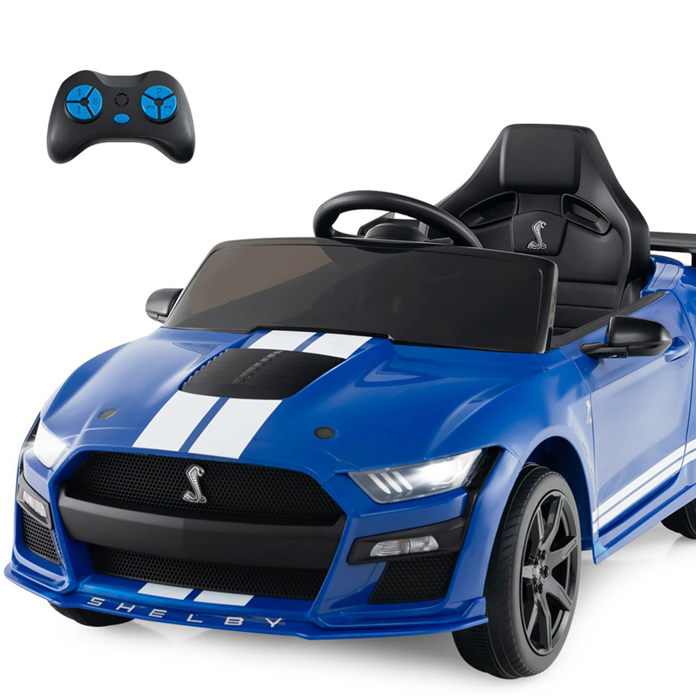 Ignite little imaginations with a thrilling blue electric ride-on inspired by the iconic Ford Mustang Shelby GT500, designed for children aged three to eight who crave adventure. Children can take the wheel themselves or parents can guide them safely using the remote control. Plus, two-speed options and a soft start-stop feature ensure every journey is smooth and exciting. The media centre amps up playtime with a USB port, radio, and music player. The realistic horn and engine sounds offer an authentic driving experience. Treaded, puncture-proof wheels handle multiple surfaces. Premium touches like rearview mirrors, LED lights, adjustable safety belt, and lockable double doors make every drive memorable. The battery provides one to two hours of playtime, and easy controls mean young drivers can focus on fun without fuss.