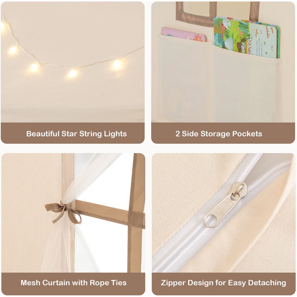 Make a cute and classy addition to your interior space with the Costway Kids Brown Play Tent with Star Lights. The spacious tent allows little ones to invite their best friends to have a role-playing game together. The breathable mesh curtains allow air circulation for better comfort. It is supported by strong PVC pipes and is very sturdy and stable. The anti-slip mat prevents the tent from sliding, while its soft coral velvet surface renders a skin-friendly touch. The upgraded bottom tube and connector as a flat threshold, making it easier for your children to get in and out and not trip over. The eye-catching star lights create a warm and cosy atmosphere while playing. Children can serve the tent as a reading nook, cosy corner or a napping spot. This children's play tent is spacious enough to accommodate three to four children or two adults at a time. It allows your little one to invite his or her best friends to play pretend games or read books together. This playhouse is also a great place for parents to spend leisure time with their children. It is built with thickened PVC pipes and triangular reinforced connections ensuring ultimate stability and will not easily collapse. The non-slip mat enhances the overall stability and prevents it from sliding during the child's play. This lovely playhouse is suitable for a children's room, playrooms, daycare centres or kindergartens. The simple structure and detailed instructions enable you to easily put this children's play tent together, saving more time and energy. Suitable for children between the ages of three to ten years.