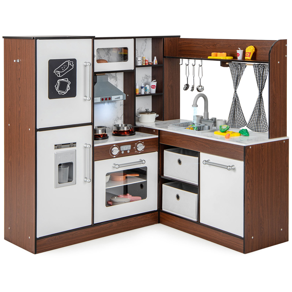 Enrich your little one’s imagination with the Costway Brown Kitchen Play Set with Lighted Range Hood. The play kitchen has realistic lights and sounds on the range hood and simulated stoves, making it look more like a real kitchen. The rotary knobs can also make “click” sounds when children turn them. This faucet and sink also have a water circulation system for a real washing experience. The real ice maker enables them to place ice cubes and press to get ice cubes. This play kitchen is also equipped with a microwave oven, a bottom boaster, a chalkboard and a telephone for added fun. The pretend play kitchen is designed with decent storage space to keep everything organised. The hook on the left side is ideal for hanging a chef hat and an apron. The four hanging hooks can be used to hang your kitchen utensils. It features one top storage shelf, one single-door cabinet, two open shelves and two fabric drawers for storage. This kitchen play set is ideal for any corner of the living room or playroom. The rounded and burr-free edges avoid accidental bumping or scratching. It requires 2 x AAA batteries (not included). Please note: Make sure that the water in the sink is above the outlet level to help the faucet pump up water. Do not splash water on the wooden parts of this play kitchen.