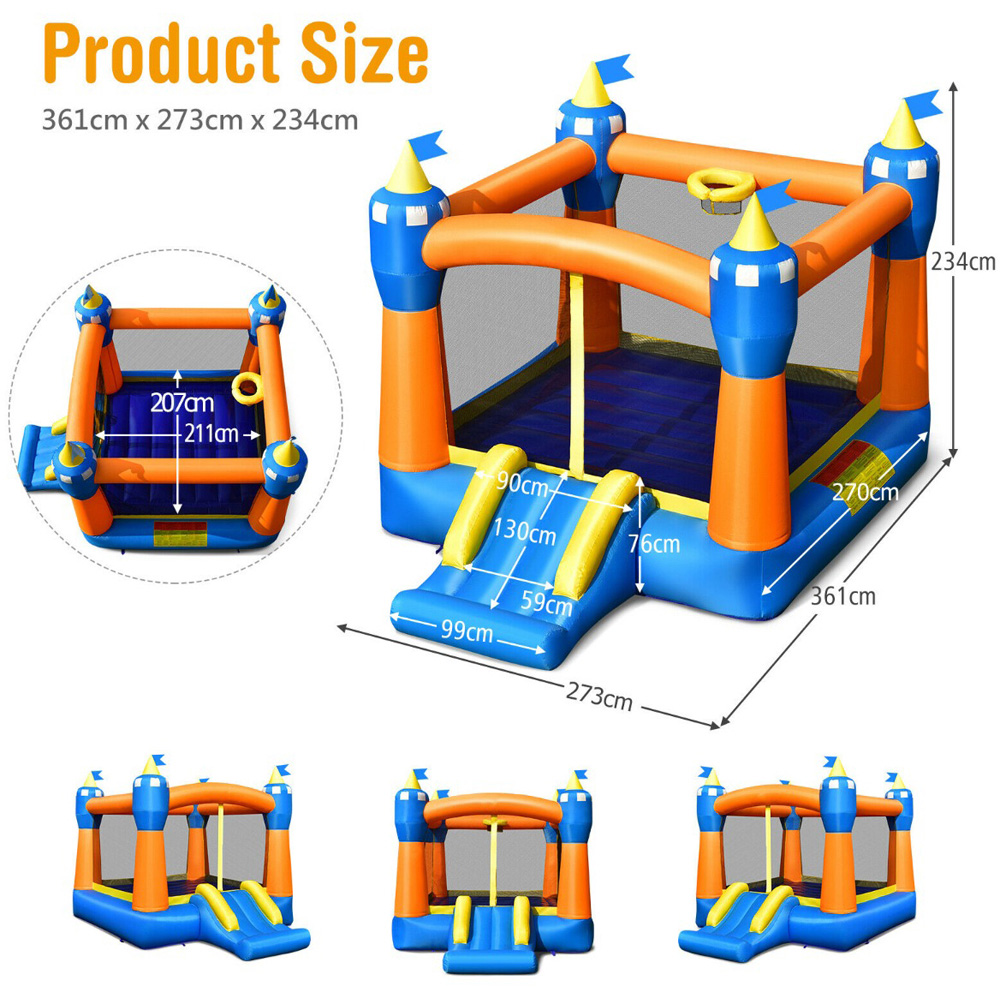 Indulge your little ones in a world of fun and adventure with the Costway Kids Cute Castle Bouncer with Carrying Bag, complete with a basketball rim and slide. Crafted from high-quality Oxford cloth, this inflatable bounce house stands out with its waterproof, abrasion-resistant, and anti-scratch properties, ensuring a safe and durable play environment. The three-in-one design offers a large jumping area, a basketball rim, and a curved slide, providing hours of active fun while encouraging physical fitness and reducing screen time. It's perfect for children aged three to ten years old and supports up to 45kg per child. Easy to set up and take down, this bounce house comes with practical accessories like ground stakes, a repair kit, and a carrying bag, making it ideal for indoor and outdoor use. It is recommended to use a 480W air blower(not included), and normally, some air comes from the fabric surface and seams. Note: Please keep it in a dry and ventilated place when not in use.