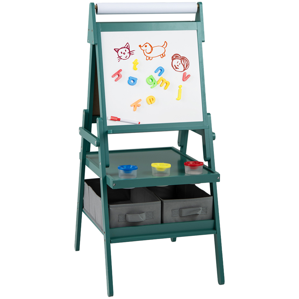 Spark creativity and let imaginations run wild with the Costway Dark Green Double Sided Kids Easel with Magnetic Whiteboard and Chalkboard. It has a handy drawing paper roll for endless artistic adventures. Kids can switch between chalk, markers or paint, attach magnetic stickers and explore drawing, writing or spelling. It also keeps tools organised with two pen trays, a spacious storage tray, two fabric drawers and three paint cups. The sturdy A-shaped frame ensures stability during play and learning, making it an inspiring addition for little artists in any home. Complying with EN71 and REACH standards, it’s a thoughtful choice to encourage hands-on learning and creative expression.