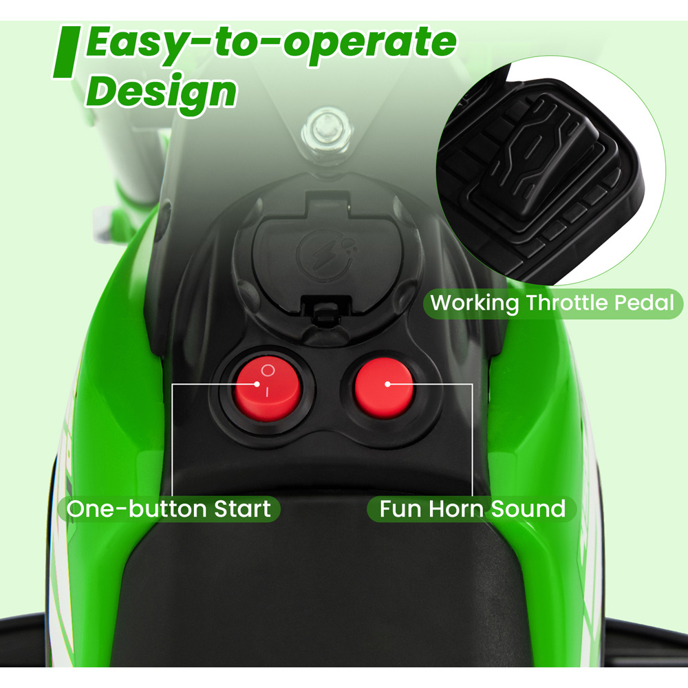 Ignite your child's imagination with a Honda-inspired green electric motorbike featuring a realistic horn and anti-slip handlebars for safe adventures. Designed for little explorers, the cool ride on motorbike offers easy operation with a simple power switch and foot pedal, letting children feel the thrill of the road. The sturdy three-wheel structure ensures great balance on any surface, while the smooth seat and comfortable grip make every journey enjoyable. Powered by a rechargeable battery and strong motor, children can cruise for over an hour at a safe speed, making it an exciting and secure choice for young riders.