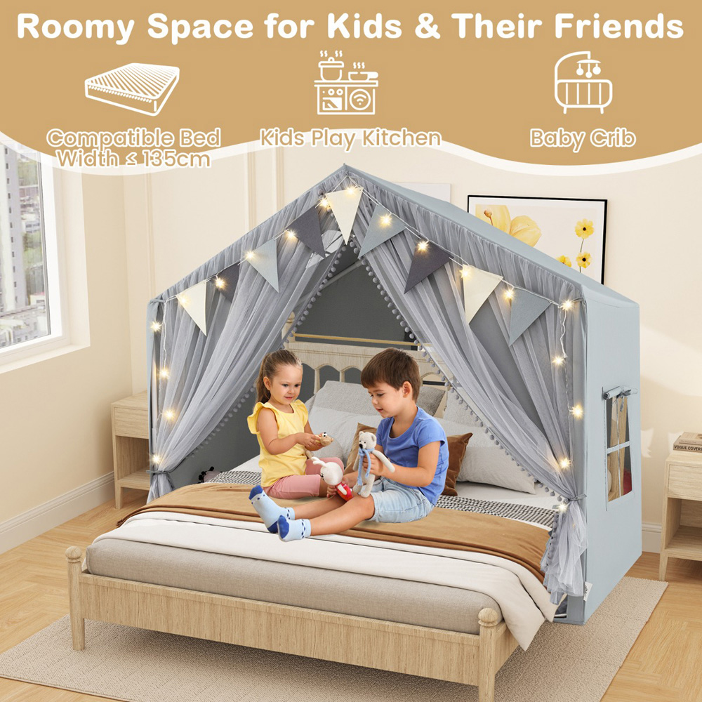 Transform playtime into a magical adventure with the Costway Kids Grey Large Tent House Play Set with Fabric and Screen Curtains. It can create a cosy indoor haven for up to four children. Soft padded mat ensures safe and comfy play, while star lights and colourful pennant banners spark imagination and joy. Easy to clean and EN71 compliant, this playhouse suits little dreamers aged three and up, offering a delightful space for reading, napping or creative games.