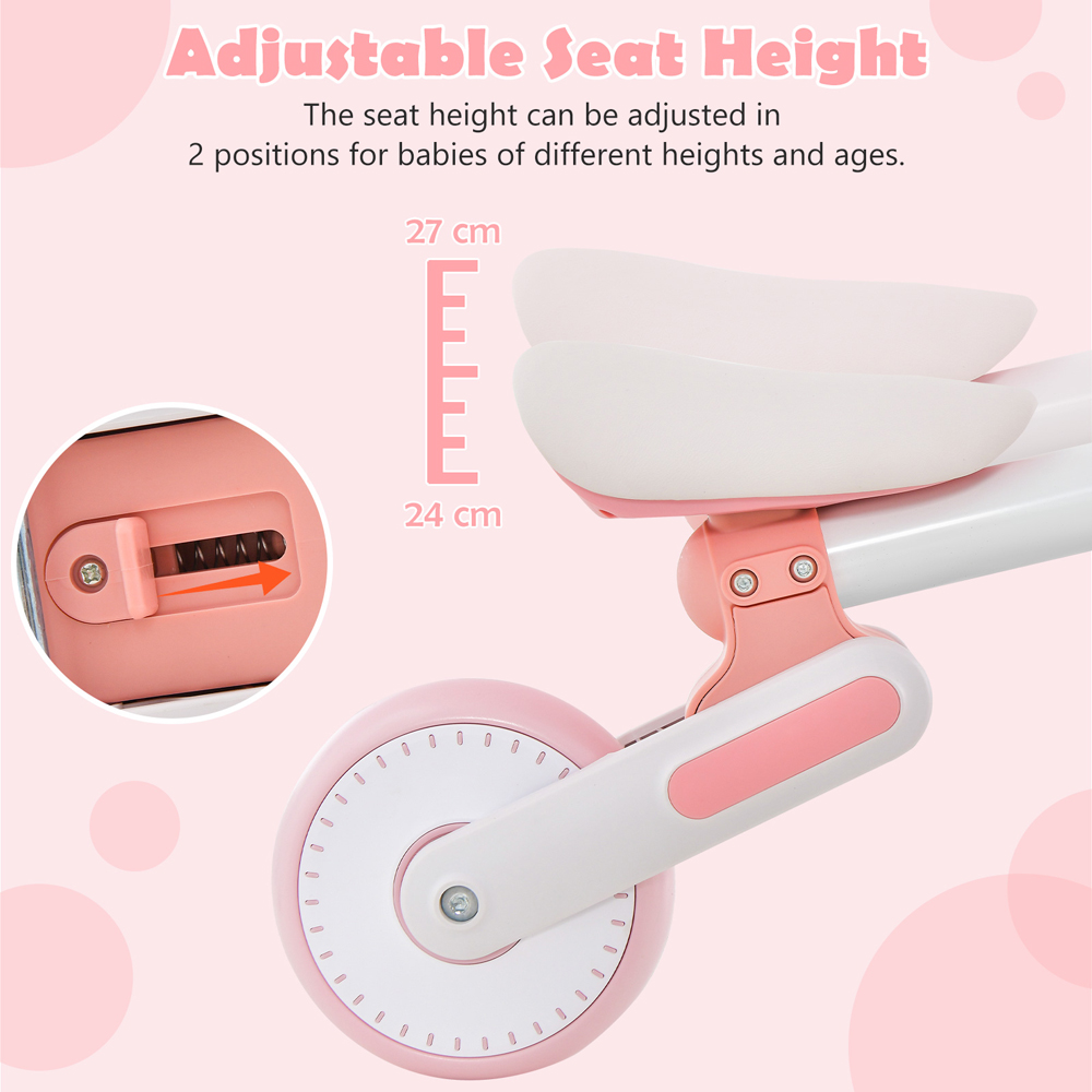 Spark excitement for little explorers with the Costway Kids Pink Balance Bike with Adjustable Seat. It is designed to support balance, strength, and confidence in children aged one to three. Featuring an adjustable seat height, it adapts as your child grows, while the 135° limited steering system adds safety for worry-free play. The sturdy frame, soft cushion seat, and noiseless wheels mean every ride is comfortable whether indoors or outside. Its foldable, tool-free assembly makes it a breeze to store and take on adventures.