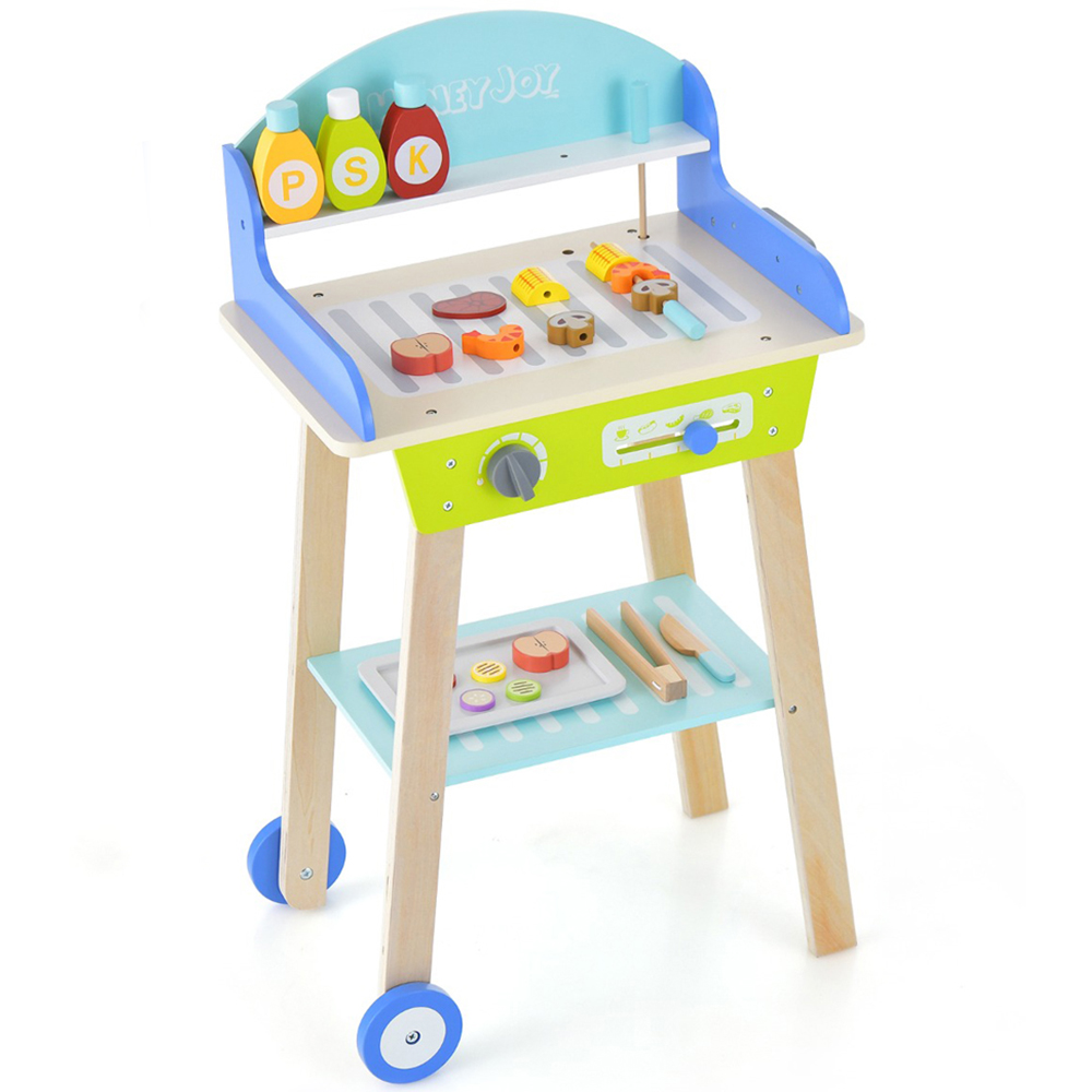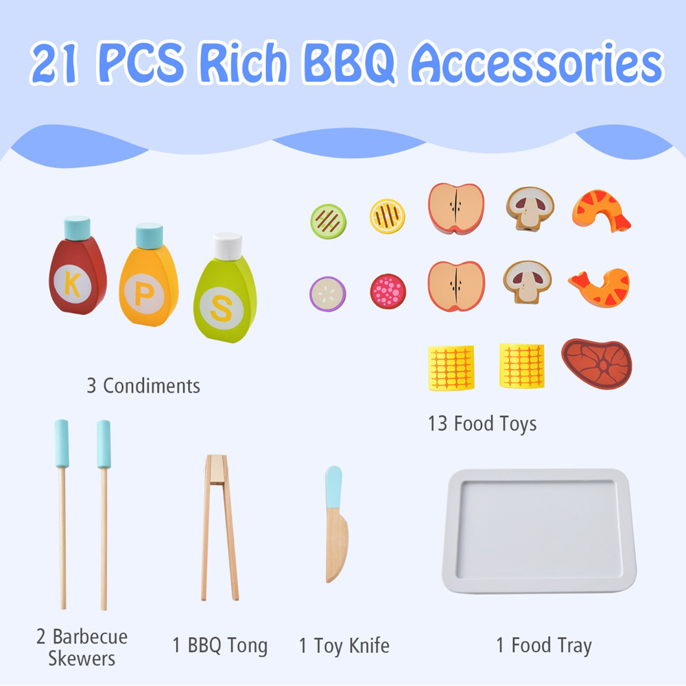 Ignite your little one's culinary passion with the Costway Kids Pretend Barbecue Grill Play Set, a delightful way for children to explore the art of BBQ with play food, a push handle, and wheels. This interactive set not only mimics a real-life grilling experience but also enhances social skills as kids play chef with their friends. Complete with a food tray, BBQ tong, toy knife, two barbecue skewers, three condiments, and 13 food toys, children can enjoy skewering and seasoning just like a pro. The set is designed for ease of use with a push handle and wheels, allowing for effortless movement from indoor to outdoor play areas, while the safe design with rounded corners and anti-falling features ensures a worry-free playtime. Certified by ASTM and CPSIA, this play set is a safe and fun choice for children over three years old.