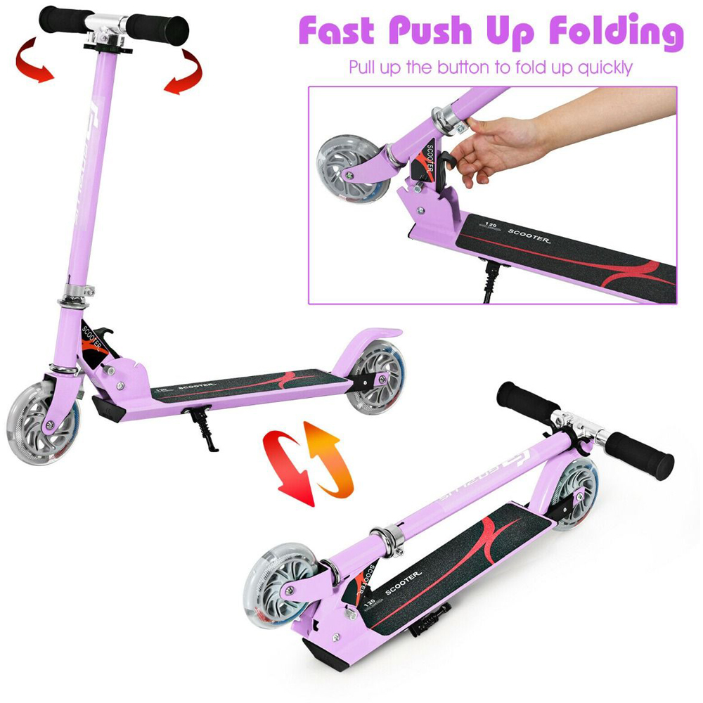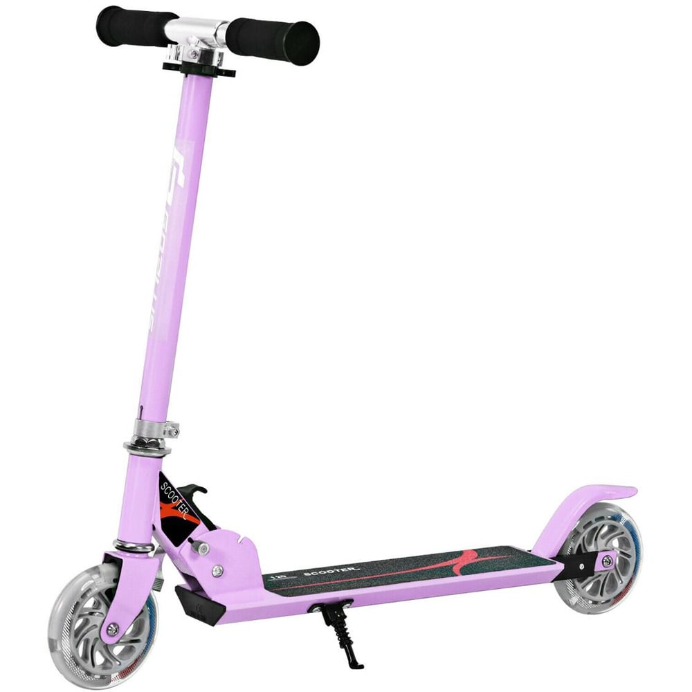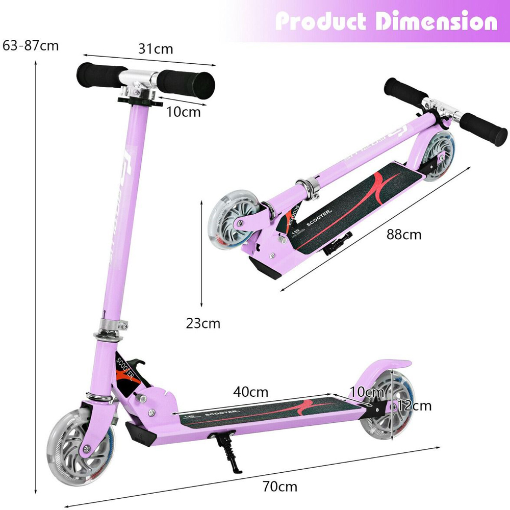 Brighten up your child's outdoor adventures with the Costway Kids Purple Folding Stunt Scooter with LED Wheels. Perfect for gifting, this scooter ensures a smooth and safe ride with its wear-resistant and shock-absorbing wheels. Its innovative easy folding mechanism allows for quick and compact storage, making it ideal for transport or tidying away. The extra-large 120mm LED PU wheels not only provide a cool, flashy experience as they light up when in motion but also protect indoor flooring. Safety is paramount with a sturdy aluminium frame and a non-slip thickened deck that supports up to 70 kg. Additionally, the adjustable T-bar grows with your child, ensuring years of fun and physical development.