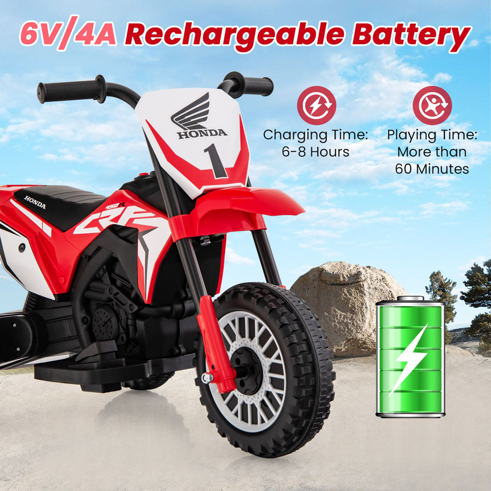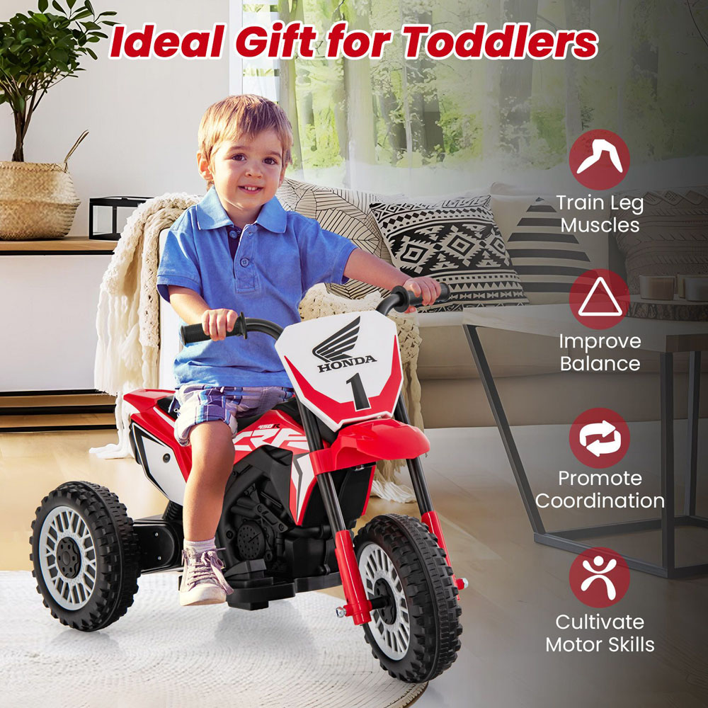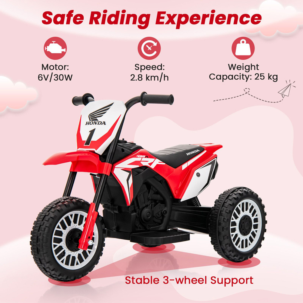Ignite your little one's adventurous spirit with the Costway Kids Red Honda Licensed Ride On Motorbike. This authentic children's motorbike captures the essence of a real motorcycle with its cool fender, exquisite patterns, and realistic horn button, making every ride thrilling. It's designed for simplicity and fun, featuring an easy-to-operate power switch and foot pedal for exhilarating acceleration. Safety and comfort are paramount, with anti-slip handlebars and a smooth, burr-free seat ensuring a steady and enjoyable journey. The three-wheel structure with wide, textured tyres provides exceptional balance and stability on various surfaces, from cement to boardwalks. Perfect for children aged 18 to 36 months, this motorbike promises over an hour of driving fun with a safe speed of 2.8km/h, thanks to its built-in 30W motor and rechargeable battery.